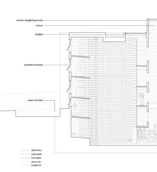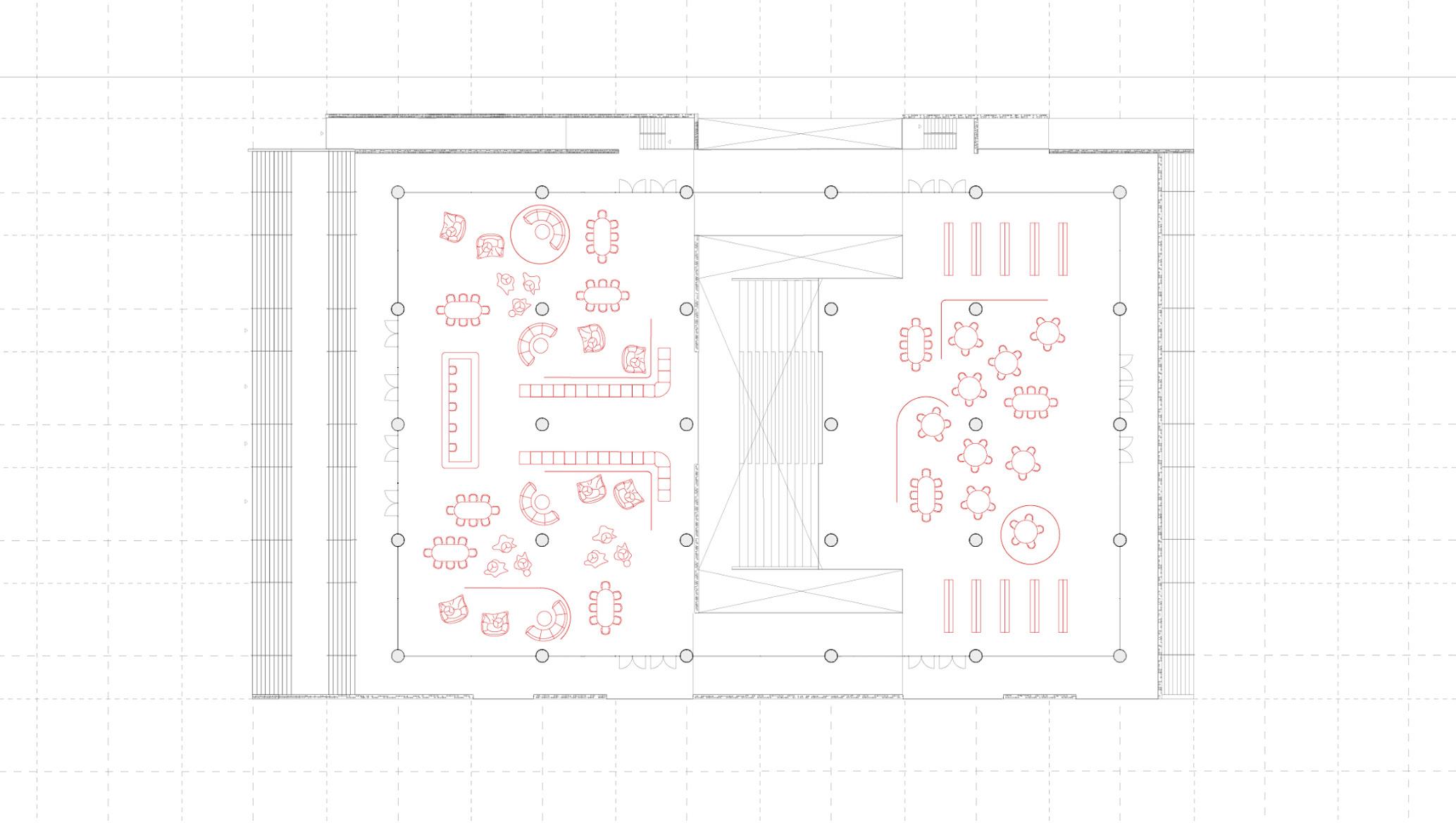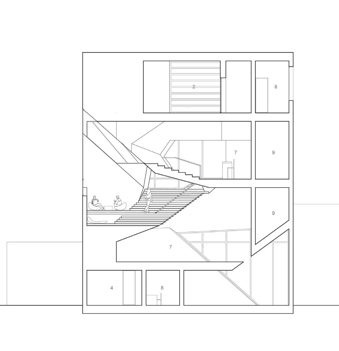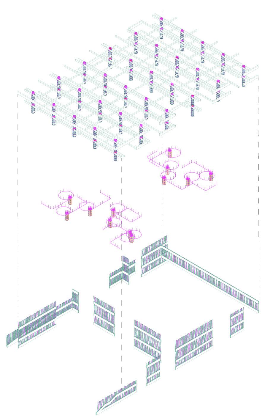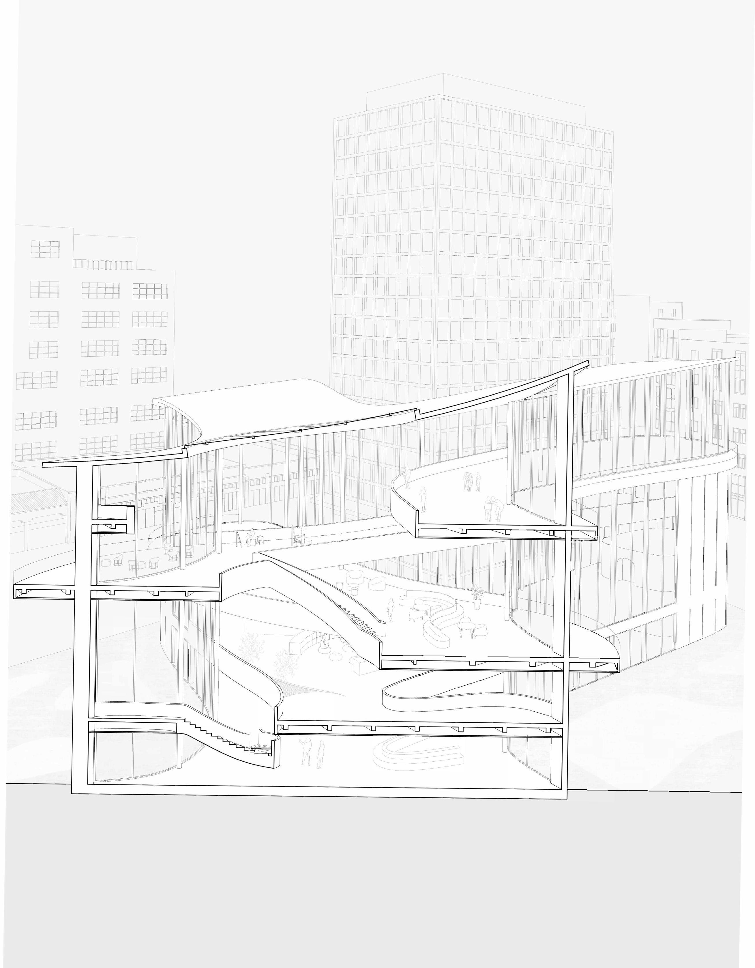 The library addition operates as both the twin and inversion of the original. Where the first compresses fragmentation within a rigid frame, the new intervention extracts fragmentation and disperses it across the site. The three distinct floor heights of the original section are translated into singlestory volumes, dissolving the square’s rigidity into a grounded, human-scaled experiential landscape. A mirrored circulation system transforms the contained stair into an expansive ramp that pulls a diagrid structure into space; together, the two structures form a dialogue of whole to part.