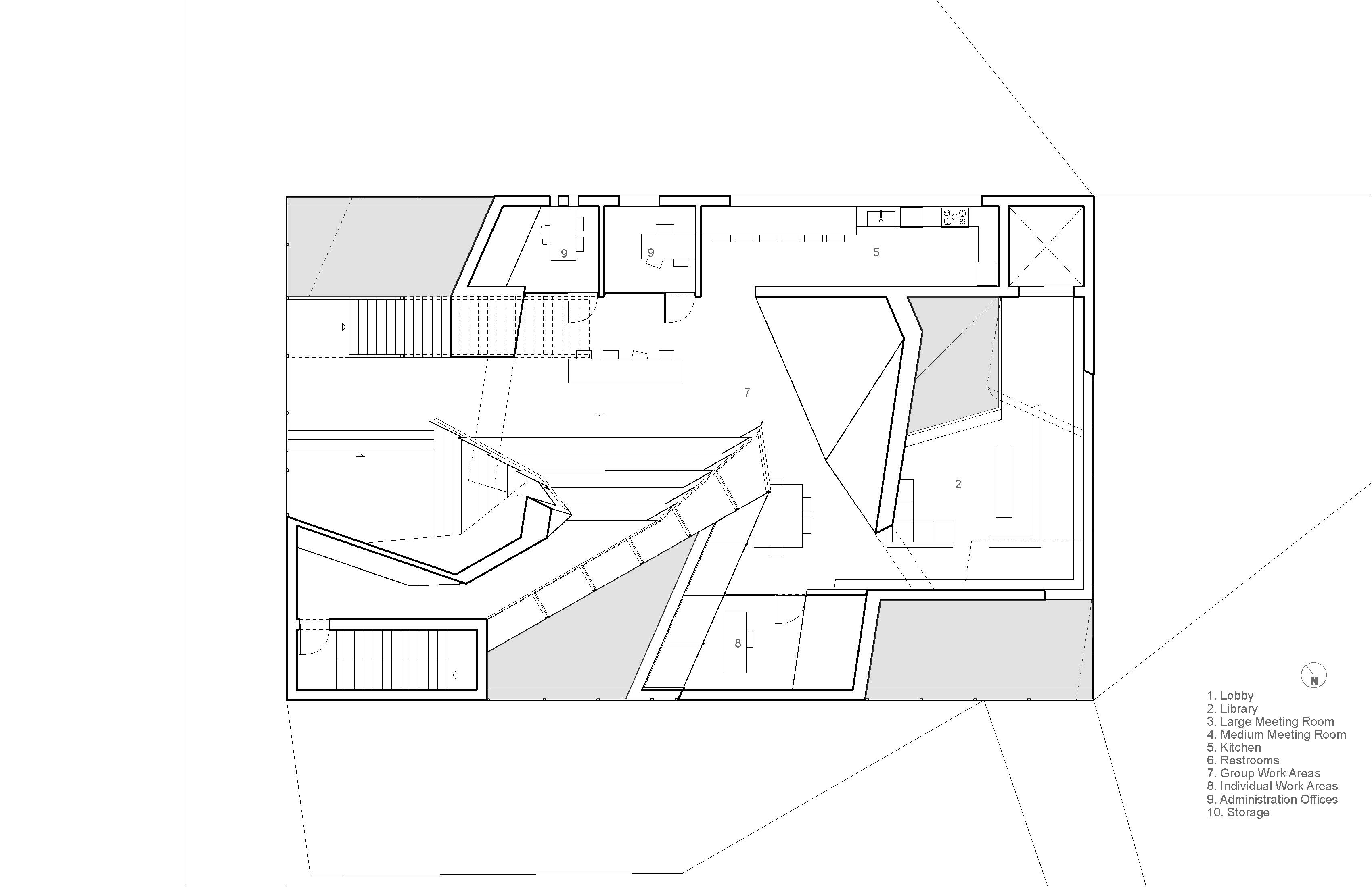 This faceted office reimagines the conventional workplace through sculptural folds that replace rigid grids with a dynamic spatial landscape. Angled planes carve out zones for focused work while opening into shared areas that encourage collaboration and informal exchange. The geometry acts as both structure and social framework, balancing autonomy and collectivity.