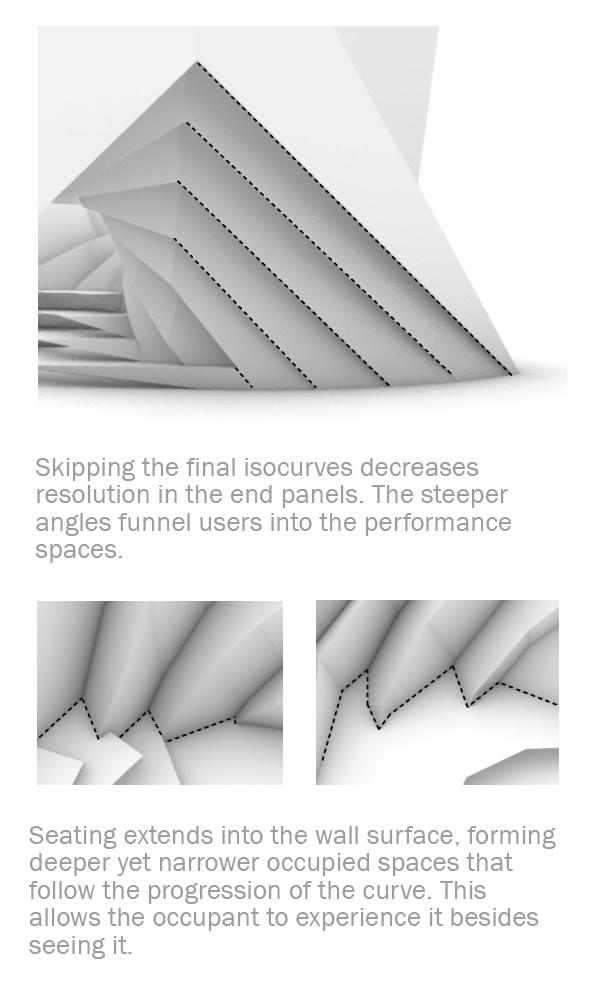 Ariana and I collaborated on all stages of the project, from geometric development to discretization and model construction. Derived from an Enneper surface, the form is translated into a folded-plate system that enables structural spanning while continuously transitioning between seating, platforms, and roof surfaces. The project organizes two mirrored performance conditions: one with orchestra performers elevated above the audience, and the other inverting this relationship. The depth of the folded plates provides structural rigidity and acoustic separation between the two performance spaces.