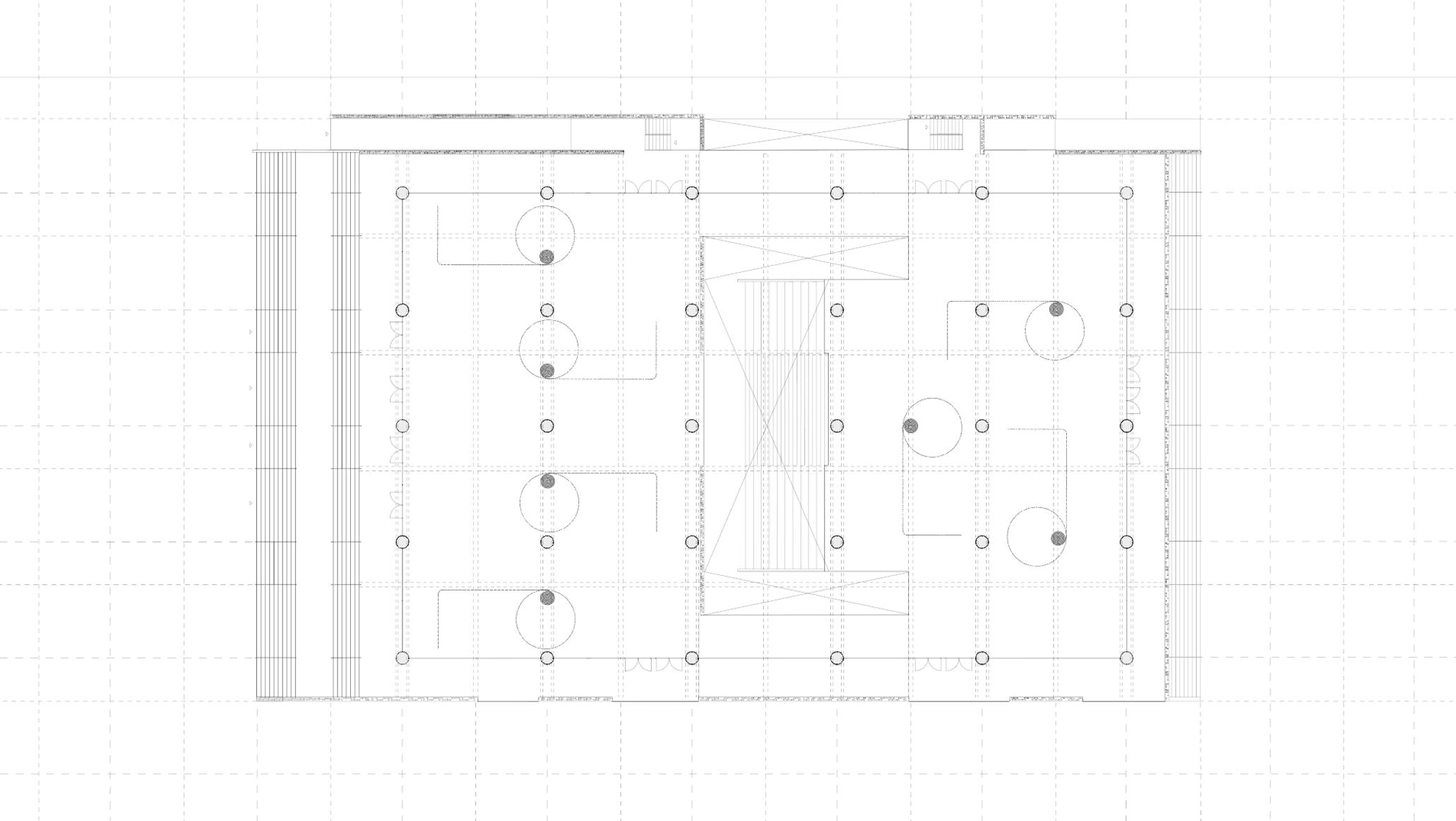 The building’s primary programs of dance, yoga, and art are conceived as fluid fields rather than fixed rooms. An open plan made possible by displacing columns and loadbearing walls to the perimeter. Structure becomes a quiet frame, liberating the interior for movement, gathering, and improvisation. A gently curving geometry organizes circulation as a continuous promenade, softening thresholds between disciplines and allowing visual and acoustic overlap. The plan resists rigid compartmentalization; instead, it choreographs gradients of enclosure and exposure, where moments of collective energy give way to pockets of retreat. In this way, the architecture embodies the ethos of its programs inviting the liberty of expression in a diverse community.