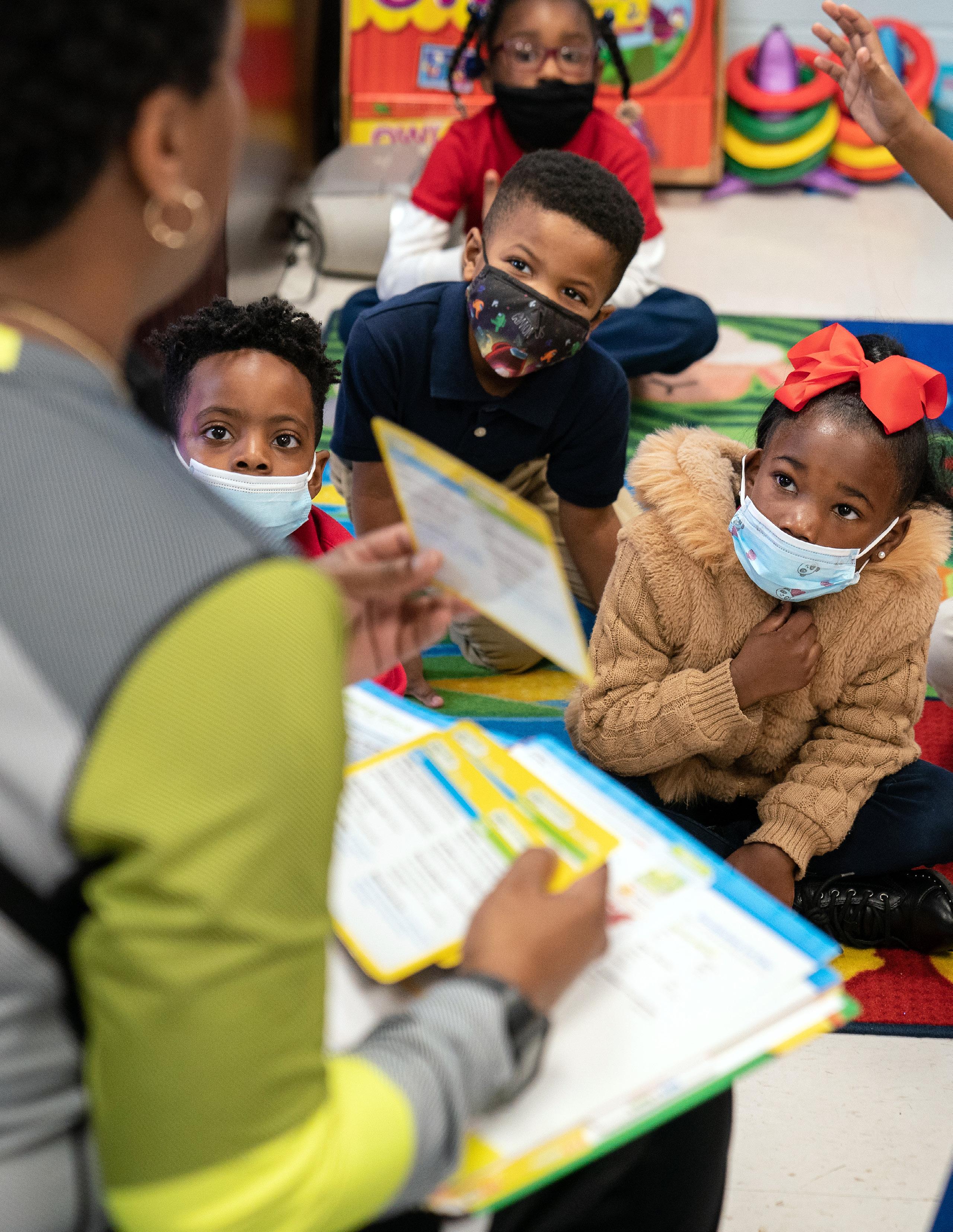 STUDENTS LISTEN TO THEIR TEACHER AT CLAUDINE BROWN ELEMENTARY SCHOOL IN THE GREENWOODLEFLORE COUNTY EARLY LEARNING COLLABORATIVE.