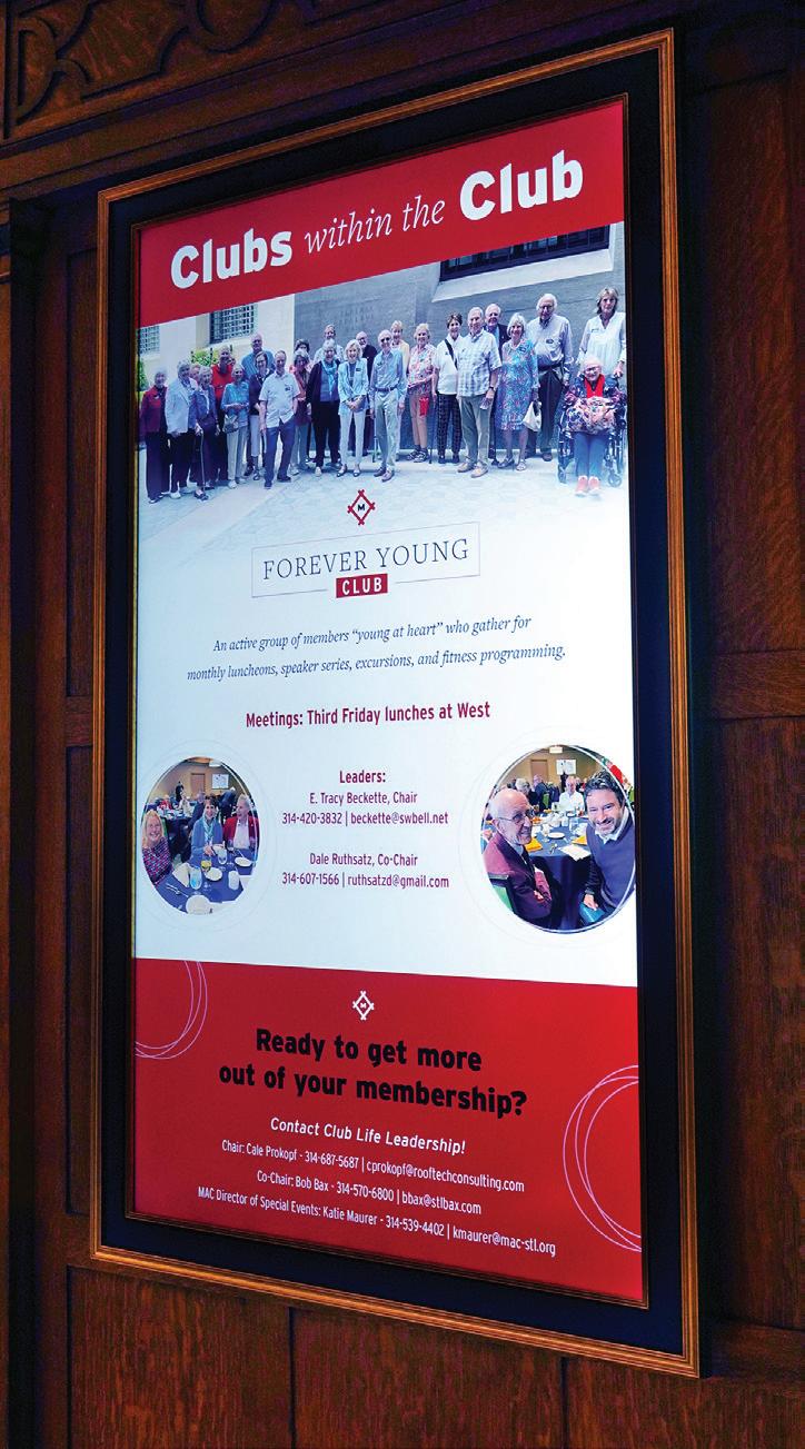 Gather aboard the Club’s parade float for the Thanksfor-Giving Parade! Members will meet at approximately 1 p.m. in the Downtown Clubhouse lobby. The MAC Shuttle will depart at approximately 1:30 p.m. to transport members to the float. Register on the MAC app or call 314-539-4402