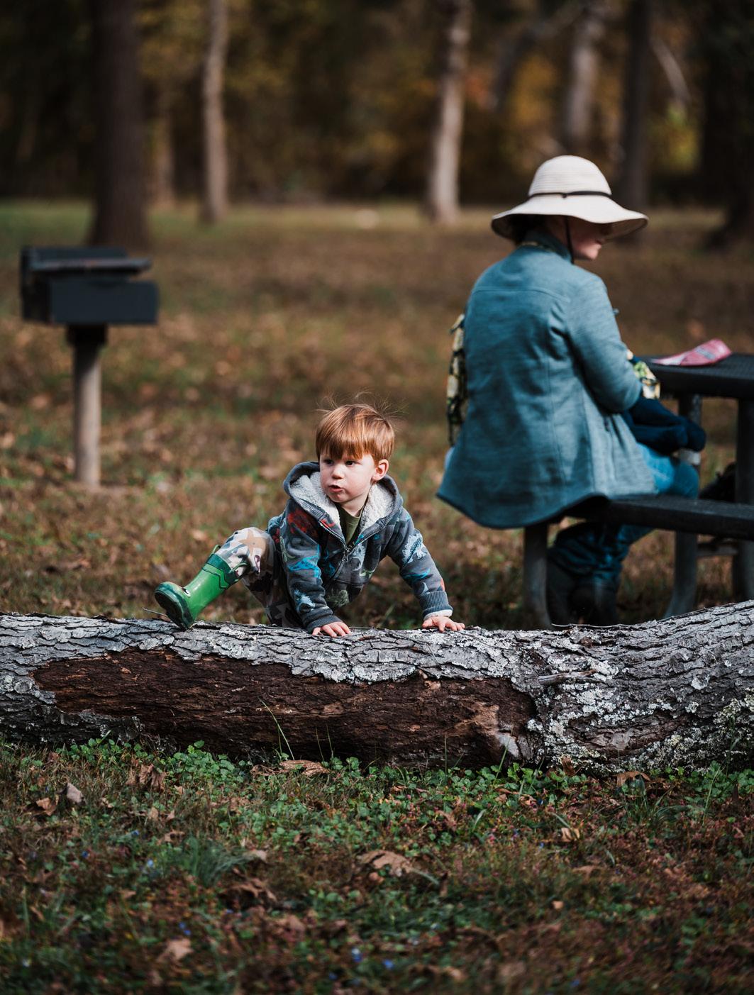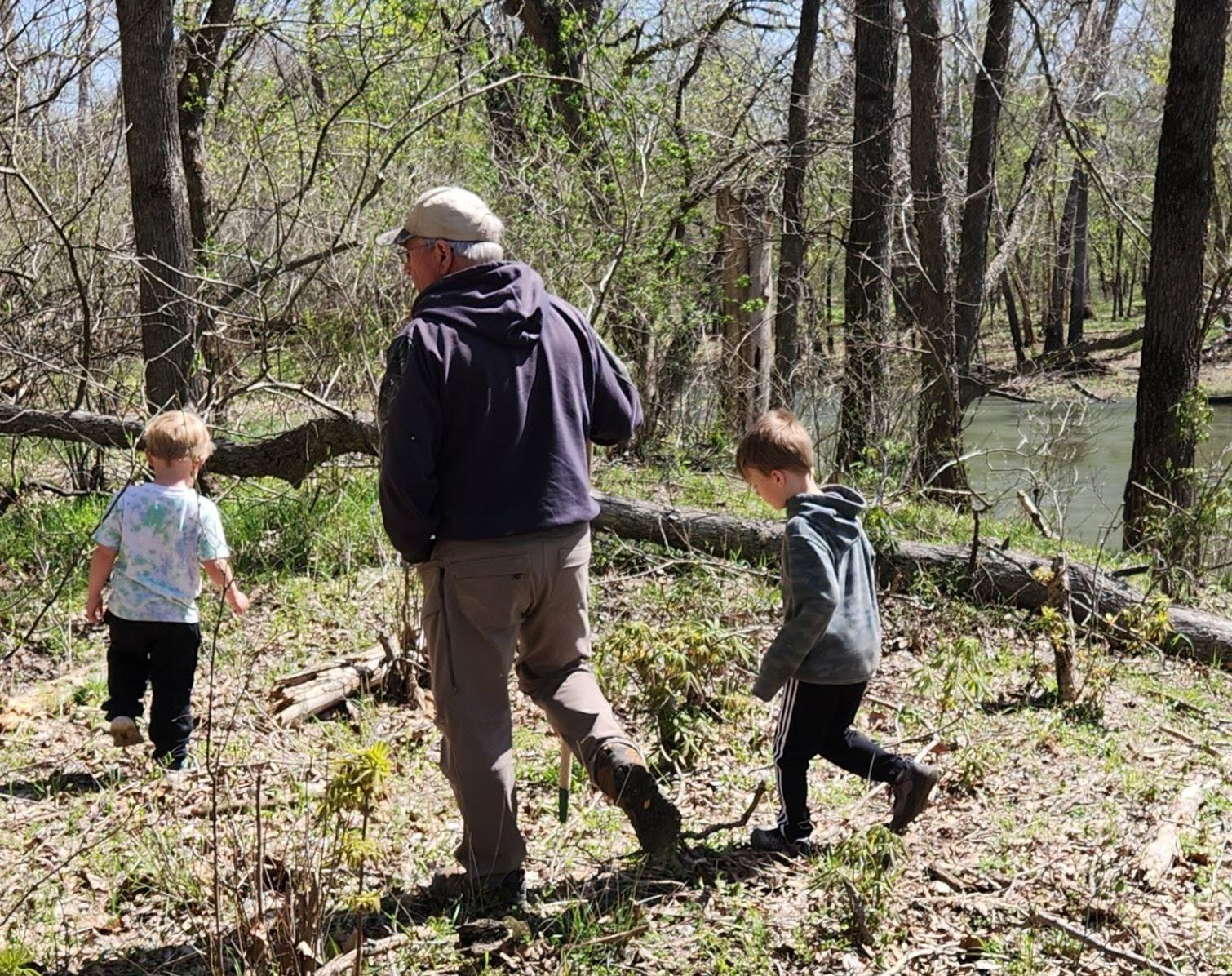 We pack up and head back up the hill out of the river bottom, still looking—at least I’m still looking for mushrooms. Frank and Ed are running around chasing each other, jumping off logs, and throwing rocks. Grandma Kim is watching the boys and trying to keep them from hurting themselves or each other, because that’s what grandmas do.