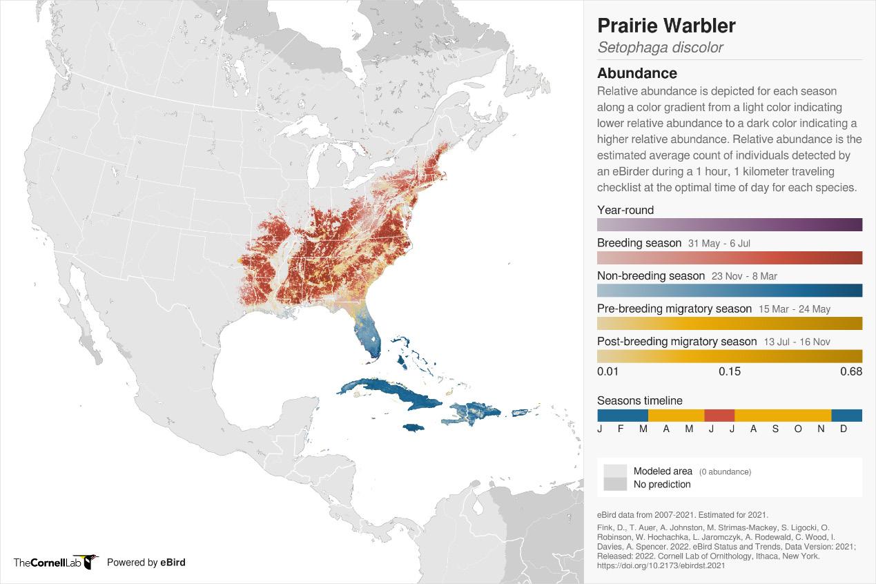 Right - eBird Trends Map for Prairie Warbler showing population trends across the species’ range. (Photo: Science.ebird.org)