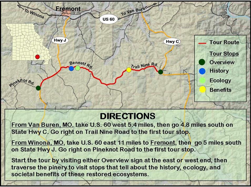 Ready to visit? Two optional routes will take you to the beginning of the Current River Pinery self-guided auto tour. At either entrance (west or east, see map), you’ll find an Overview sign. Both of these signs contain a map and directions to the other tour stops.