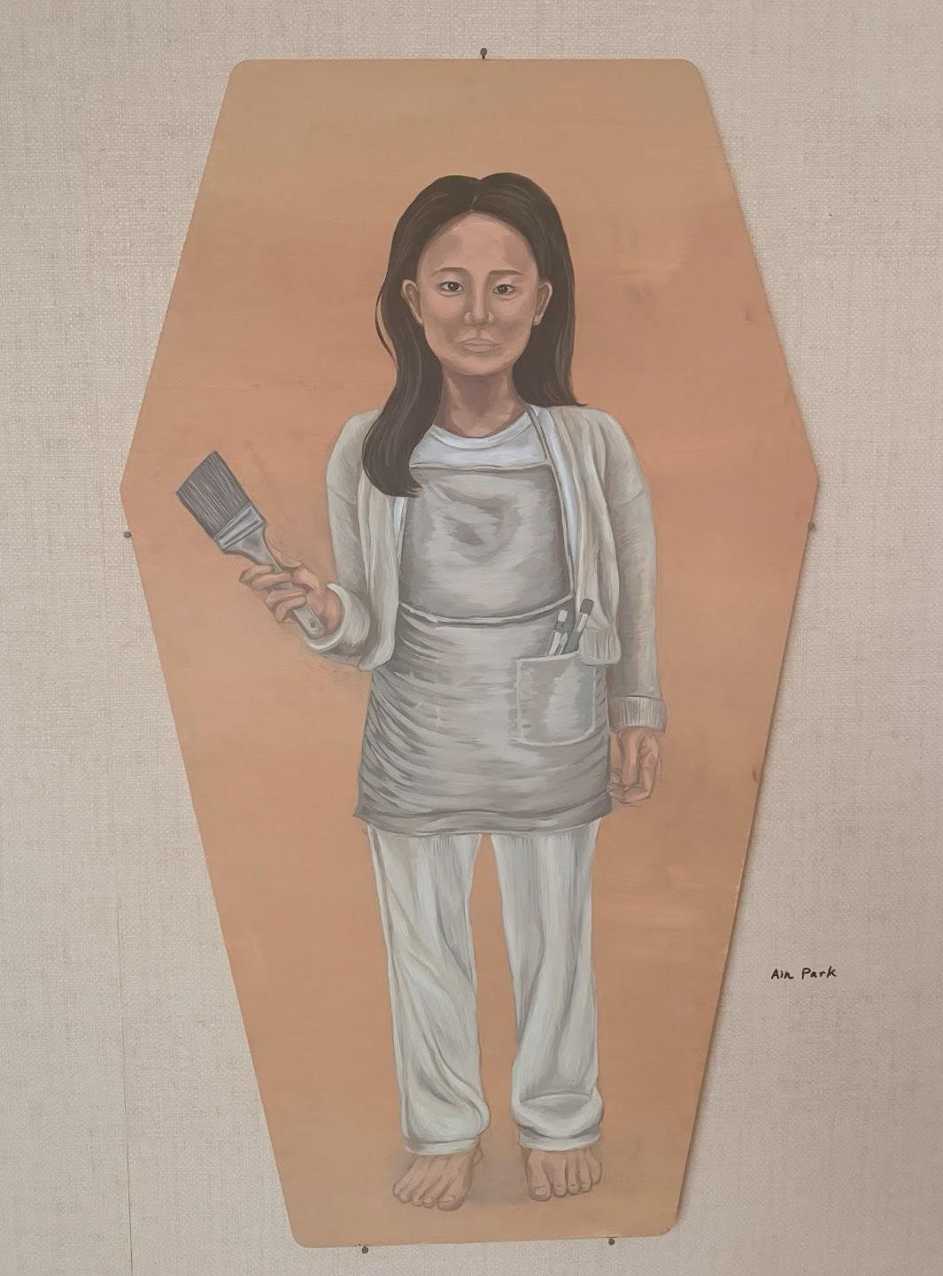 Her recent piece, “The Paris Salone,” features a self-portrait holding a paintbrush drawn on a coffin-shaped wooden board, symbolizing the career deaths faced by many impressionist artists.