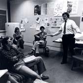 Other classes used informal classroom settings, such as this session with Joe Ferreira [middle right] and a meeting of the PEP class led by Ben Harrison [below, seated at right].