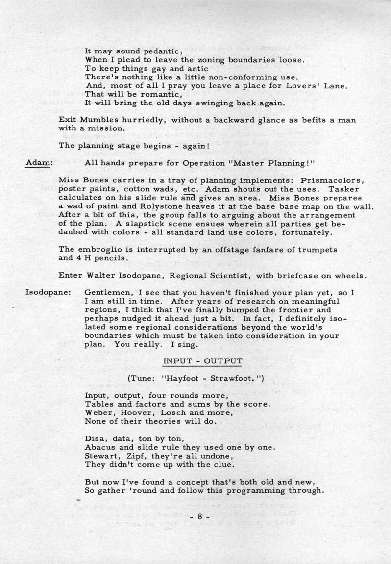 A third and final appendix is a treasured artifact from an earlier effort at celebration and commemoration. In 1956, to mark the 20th anniversary of the Department’s first MCP degree, Melvin Levine (MCP ’56) penned a musical satire of the department and planning profession, appropriately entitled “Tomorrow the World.” Other graduates of that era recall a rich departmental musical life, much of it orchestrated by Mel: Lloyd Rodwin on drums, Walter Isard on violin, Burnham Kelly on clarinet. Sadly, Mel passed away in late 2007, so we include this appendix to honor his memory and recall his humor.