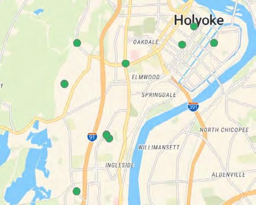 The City of Holyoke has only recently begun to make some nominal investments into electric vehicle charging. According to the U.S. Department of Energy’s Alternative Fuels Data Center database, there are ten electric vehicle charging stations in Holyoke. Three of the stations are downtown: a twoport station at the Holyoke Public Library, a twoport station at Veterans Park on Chestnut Street, and a two-port station at the Holyoke Train Station.9 These stations were installed earlier in 2022 by