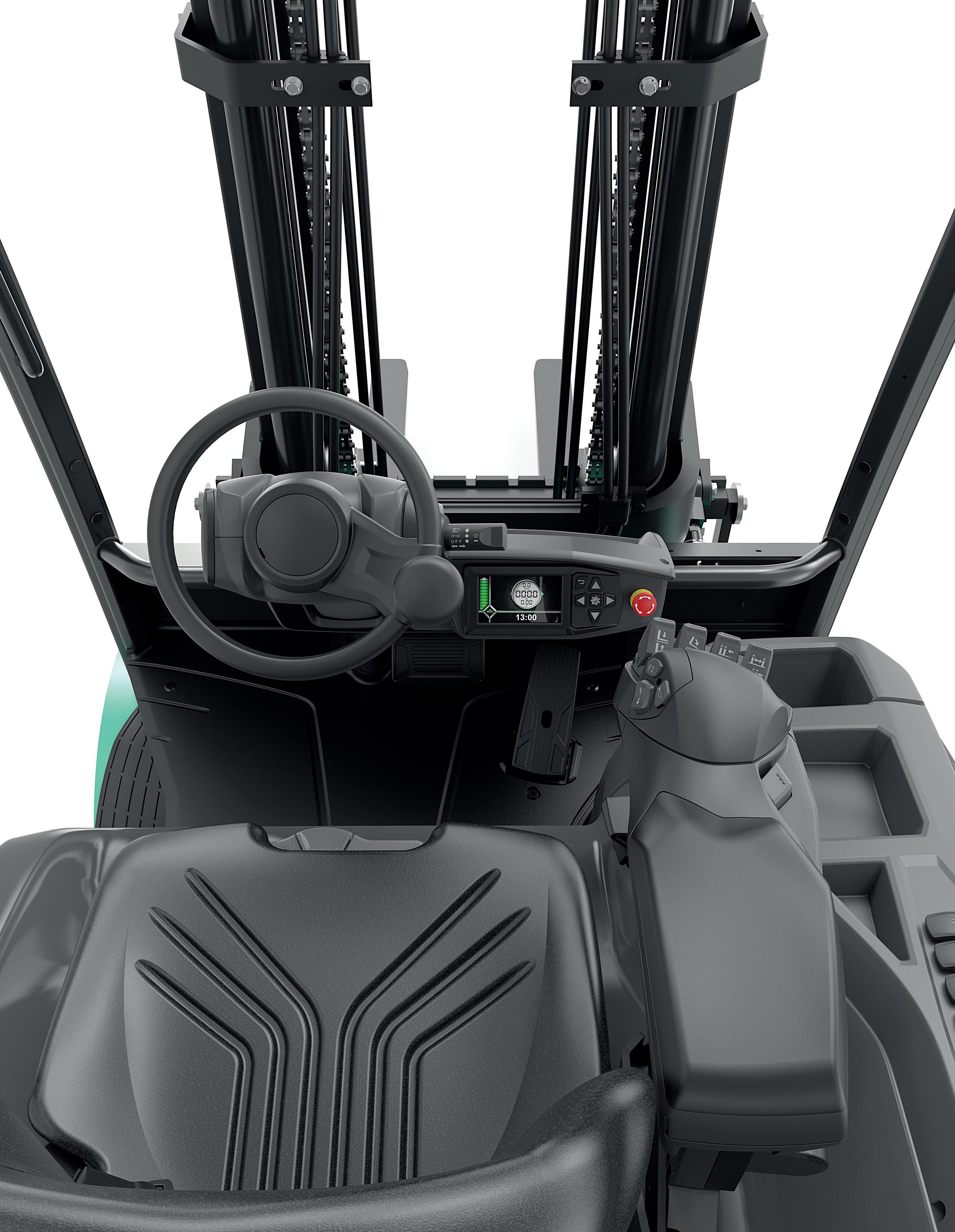 Optimoitu maston, ohjauspyörän, kojelaudan ja vastapainon muotoilu tarjoaa maksimaalisen näkymän kuormaan, haarukkaan sekä etu- ja takapyöriin, joten trukki on turvallinen ja luotettava käyttää myös ahtaissa paikoissa.