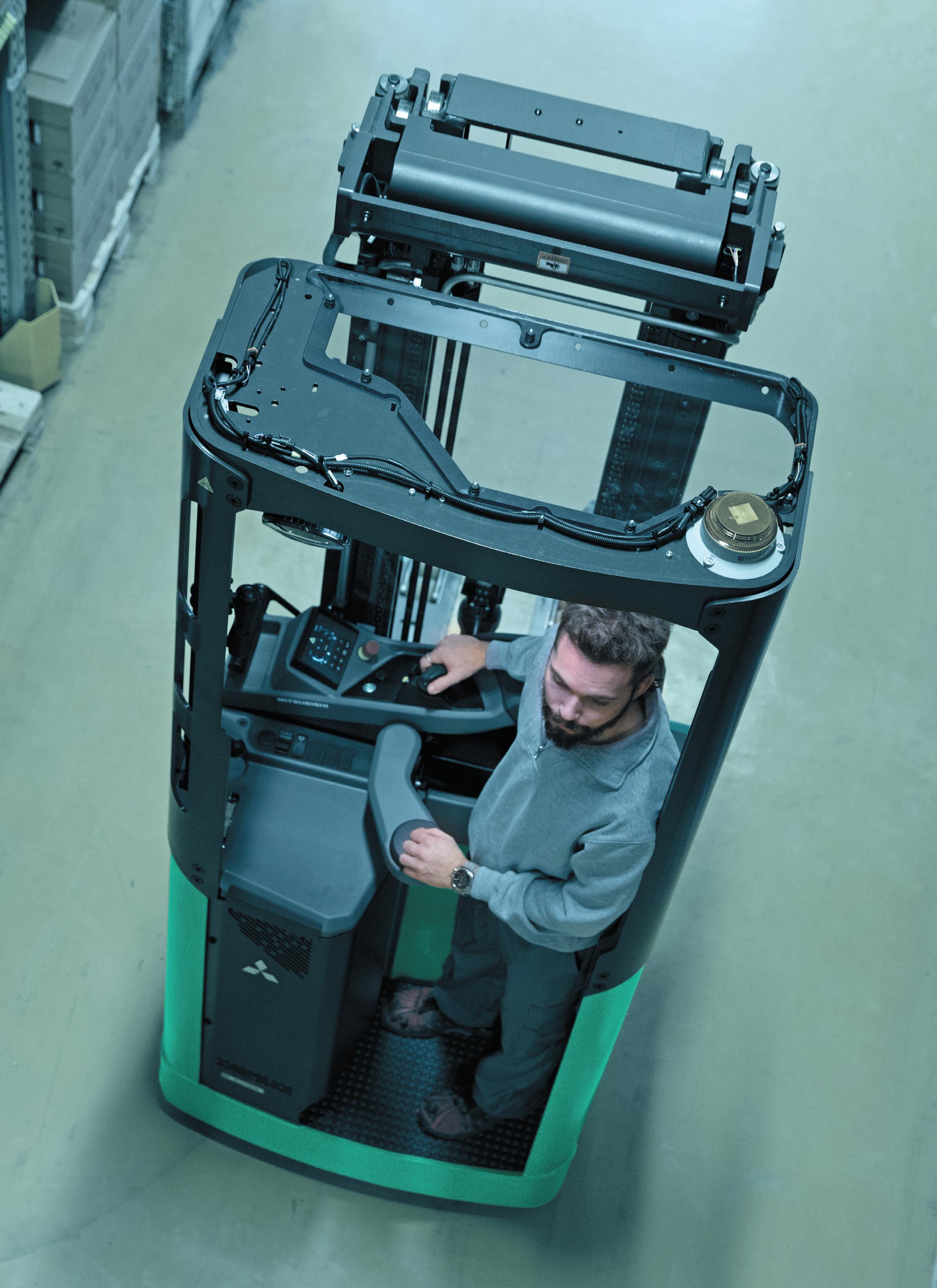 • Pohodlí a bezpečnost obsluhy: konstrukce vozíku pro sedící obsluhy zajišťuje obsluze pohodlí i během dlouhých směn. Ergonomické uspořádání prvků ovládání a sedadel minimalizuje zátěž a umožňuje trvale vysoký výkon.