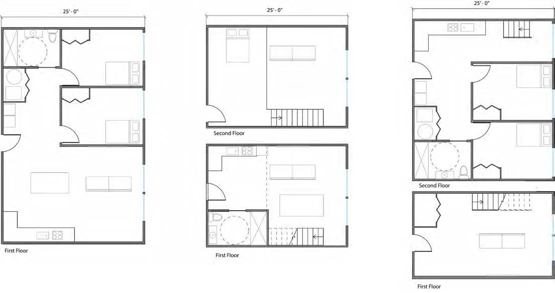 Residential Configurations. Plan studies of the three unit variations. The typologies range from 2-bedroom simplexes to flexible duplex arrangements, all organized within a standard 25’-0” width to ensure structural continuity while maximizing spatial variety.