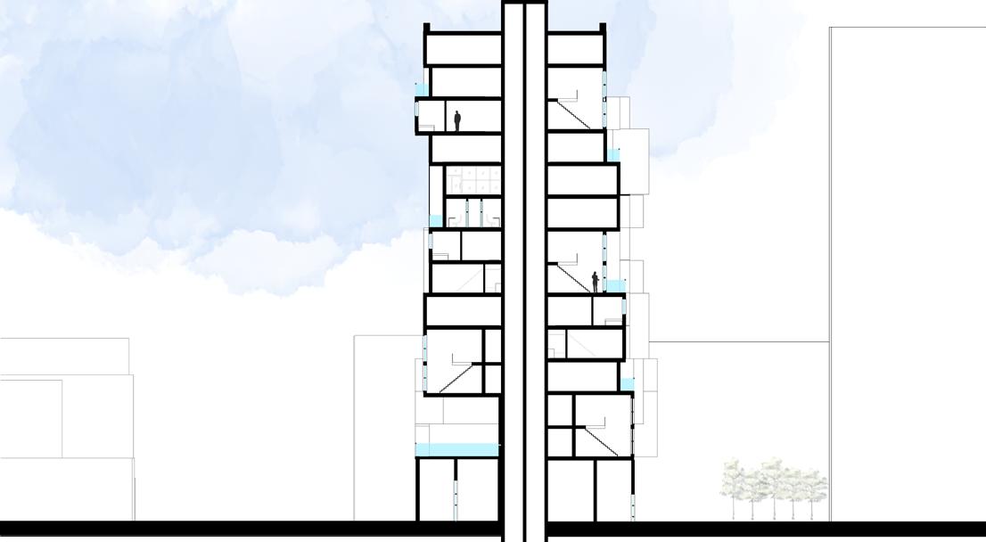 Situated within the NYCHA Bushwick Houses, this proposal introduces a new residential tower composed of three distinct apartment typologies. The units are stacked and interlocked, utilizing a push-pull strategy to generate a dynamic façade of private terraces and passive sun shading. The interior is activated by vertical light wells and shared office amenities, while the ground plane opens into a monumental 25-foot tall courtyard dedicated to local artists and merchants.