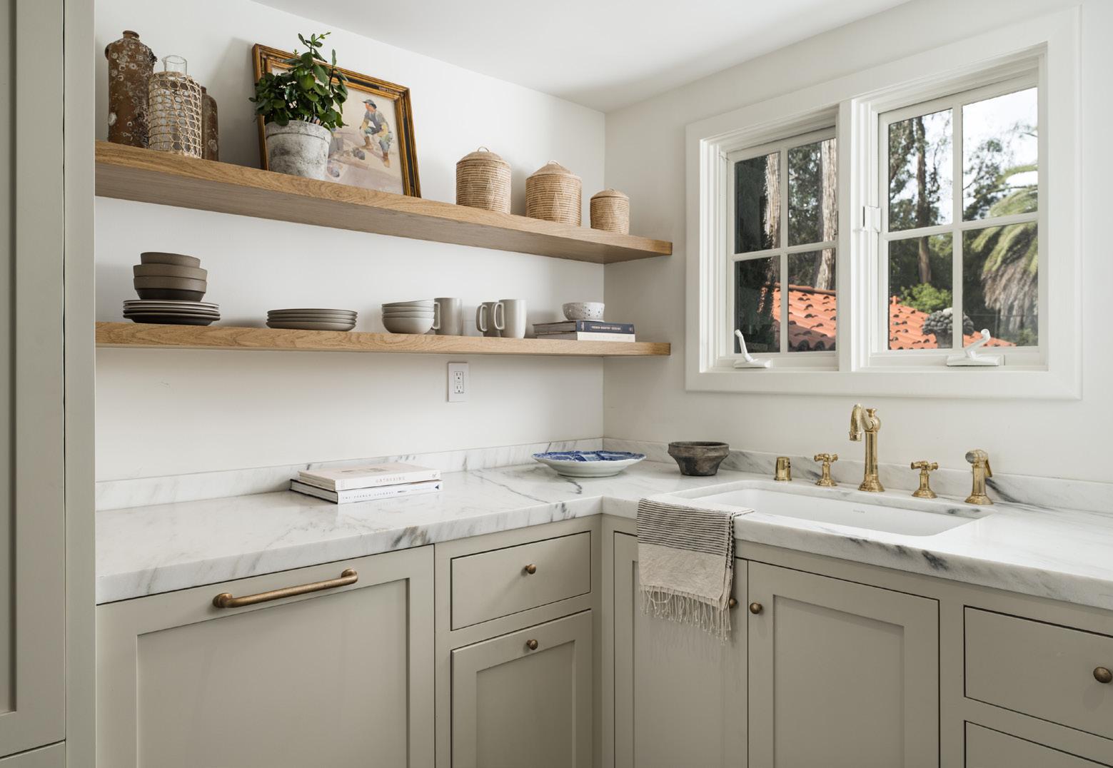 The Spanish Revival exterior complements the warm interior finishes with richly woven layers and timeless period details. The heart of the home, the spacious great room, enjoys vaulted wood beamed ceilings, arched glass pocket doors, white oak wood floors, a grand fireplace, and beveled glass windows, all of which were preserved to honor the home’s vintage appeal.