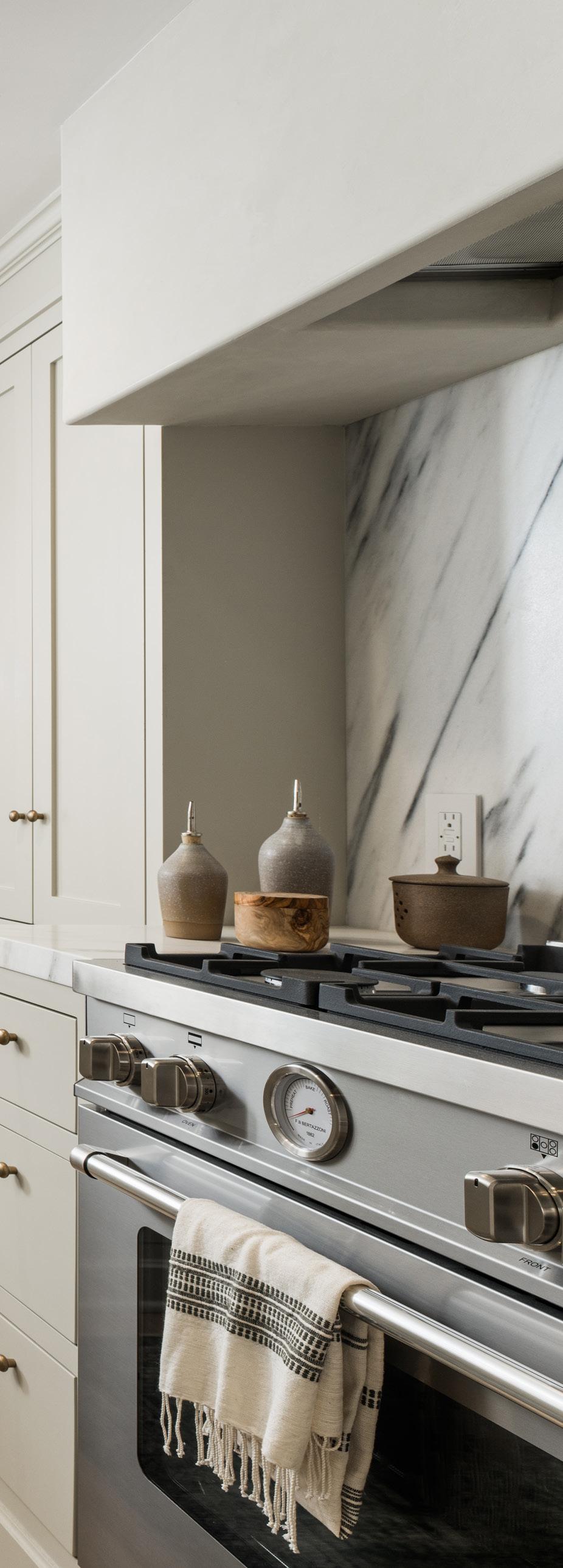 Graceful archways lead to an intimate formal dining room with beamed ceilings, and into the European-style kitchen that offers custom cabinetry, fresh fixtures, farmhouse sink, 5-burner Bertazzoni oven range, and honed Calacatta marble counter and backsplash.