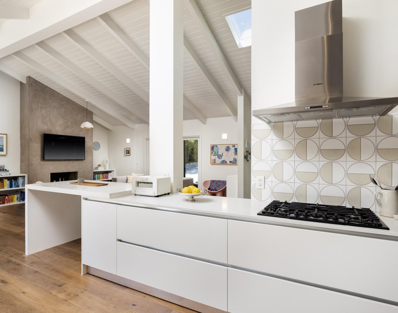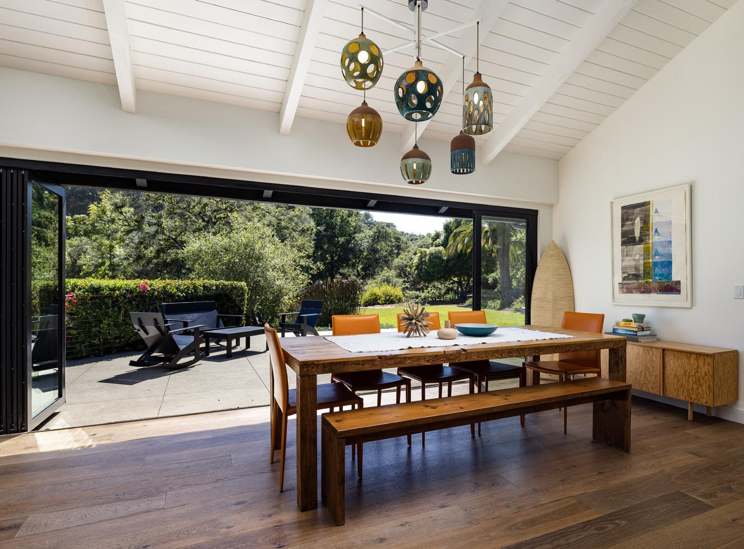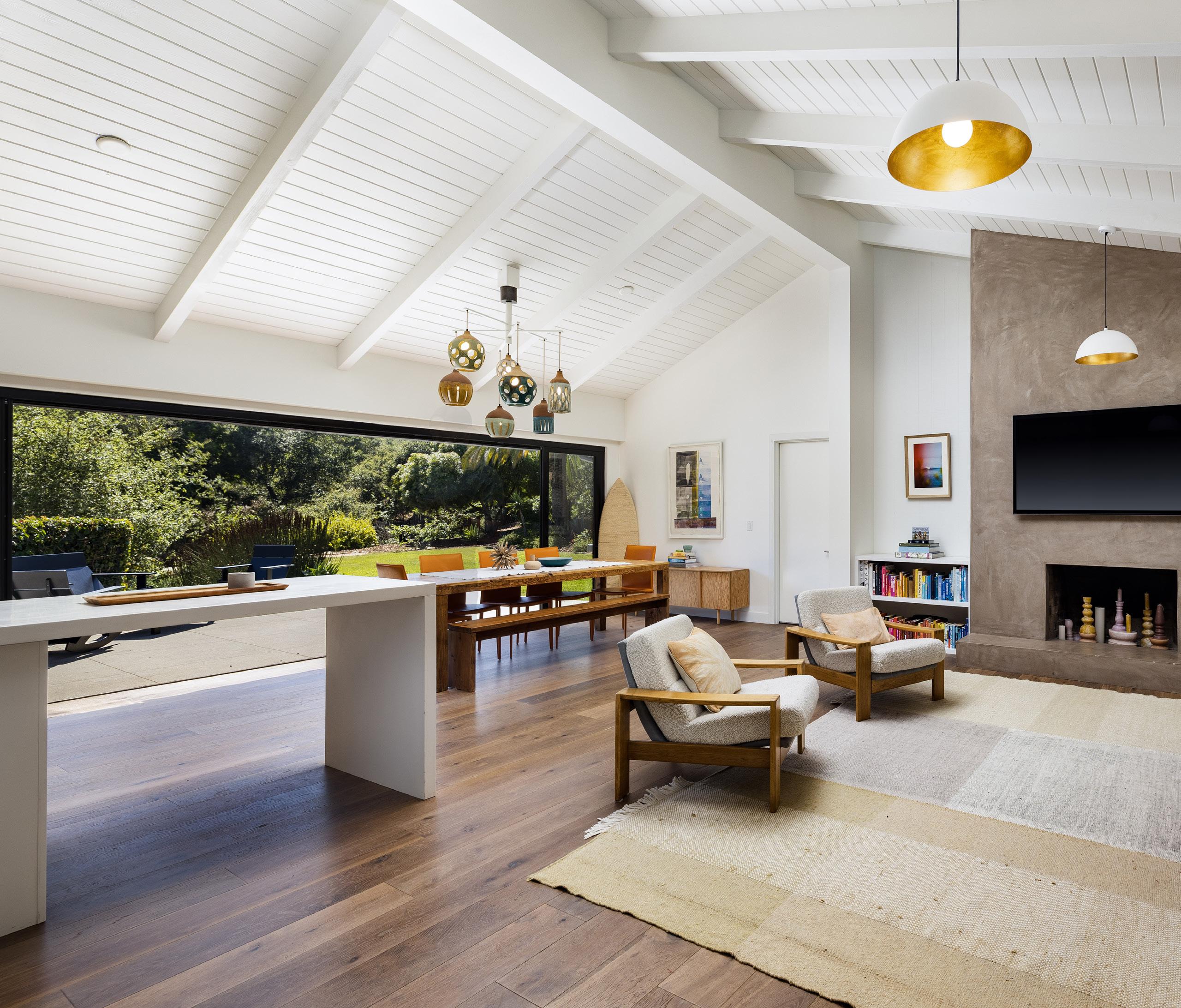 With high beamed ceilings, oak wood floors, a commanding fireplace, and ample natural light, the open kitchen and living room create a modern feel that flows throughout the home. The epitome of private indoor/outdoor living, a wall of retractable glass doors open the kitchen and living room to a patio overlooking the property’s park-like gardens, lush lawns, and mature specimen trees.