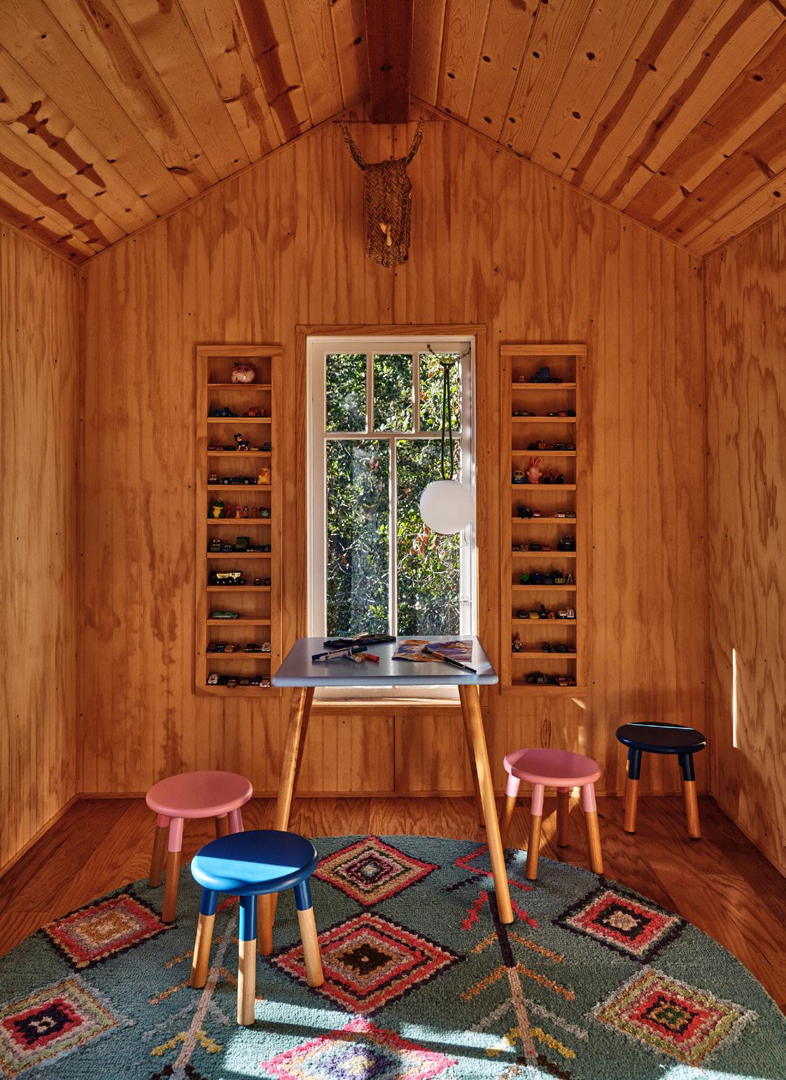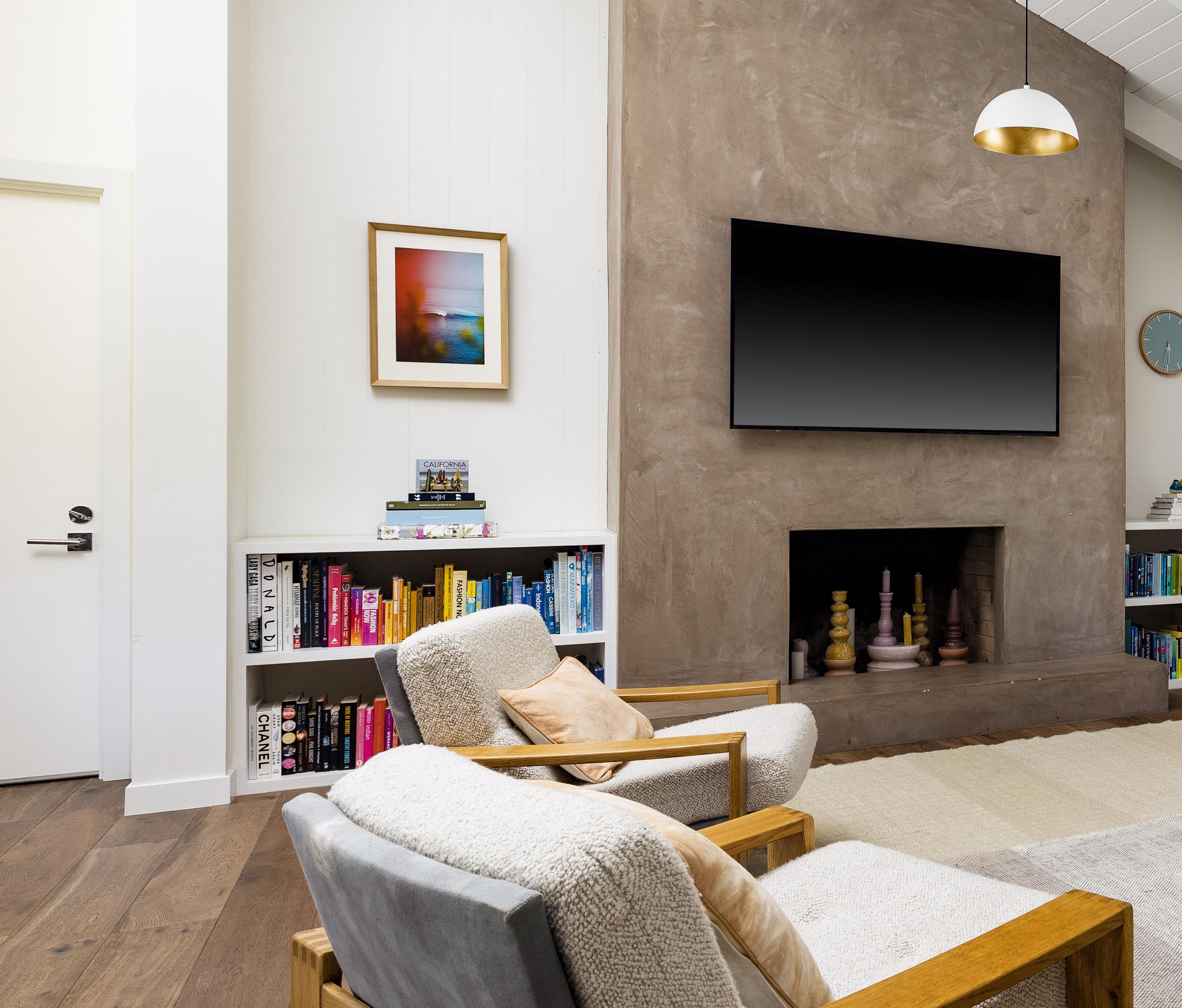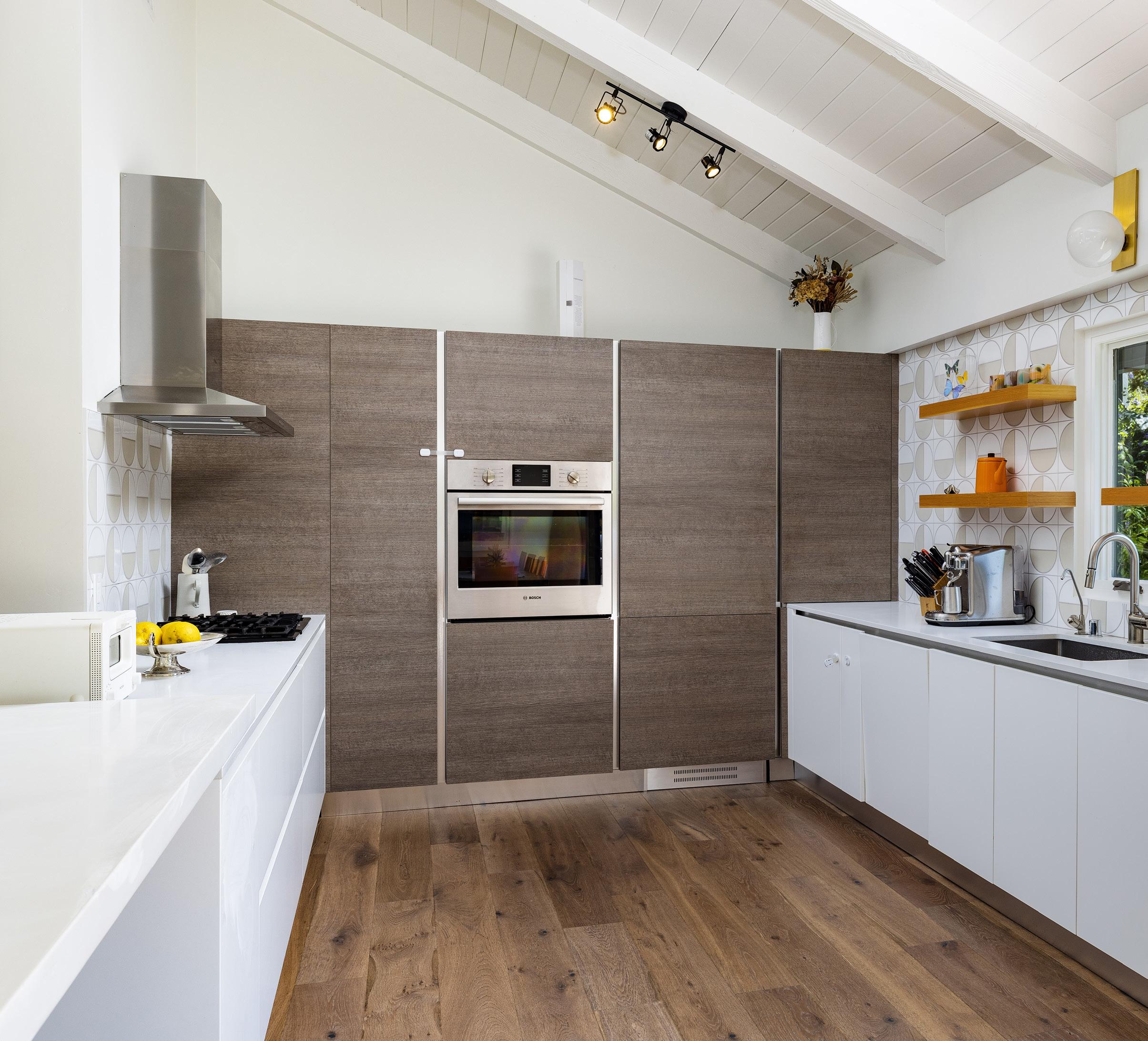 With high beamed ceilings, oak wood floors, a commanding fireplace, and ample natural light, the open kitchen and living room create a modern feel that flows throughout the home. The epitome of private indoor/outdoor living, a wall of retractable glass doors open the kitchen and living room to a patio overlooking the property’s park-like gardens, lush lawns, and mature specimen trees.