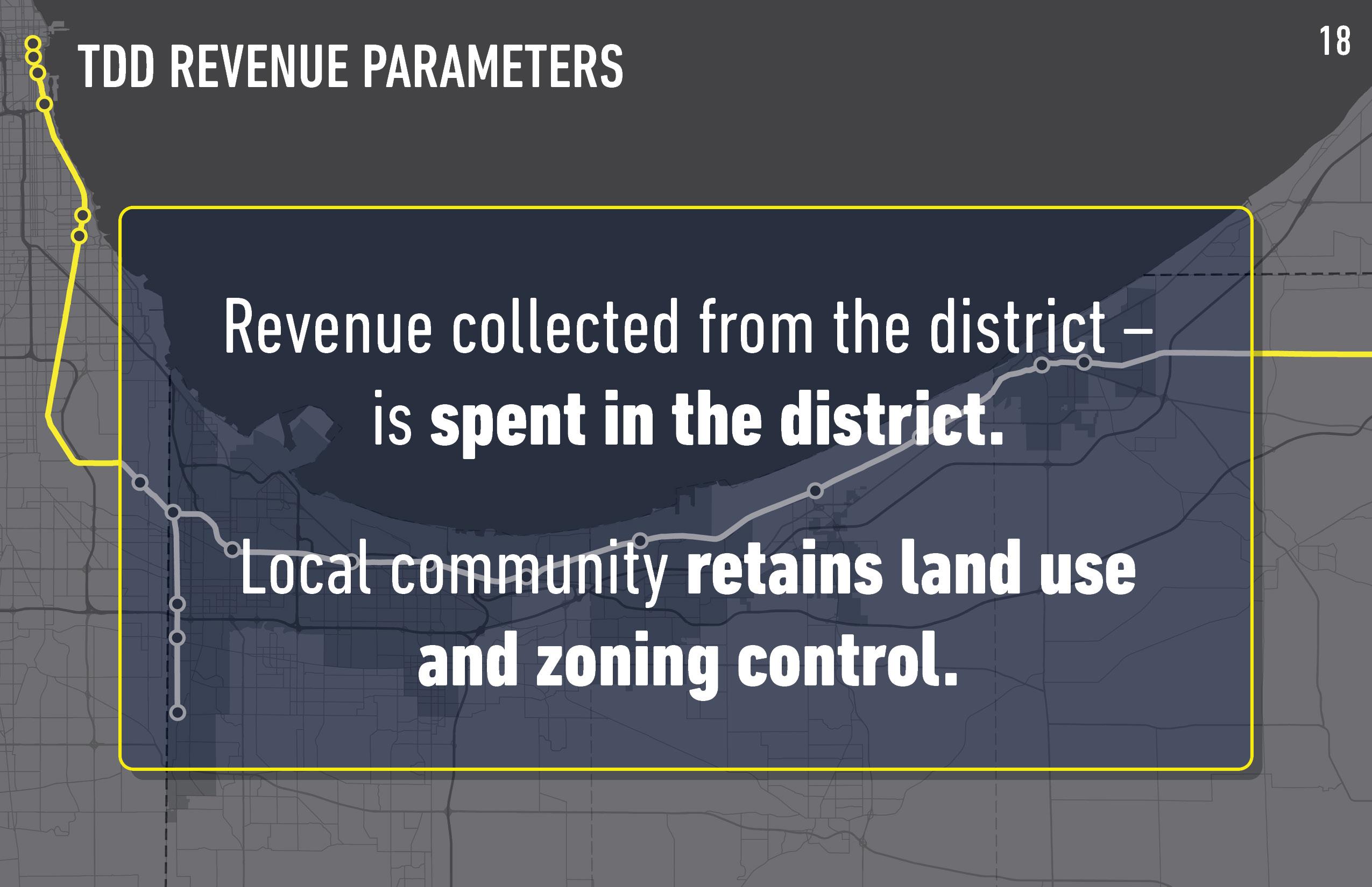 Transit development districts capture the incremental growth in local and property tax revenue, for use in public investment related to the station area.