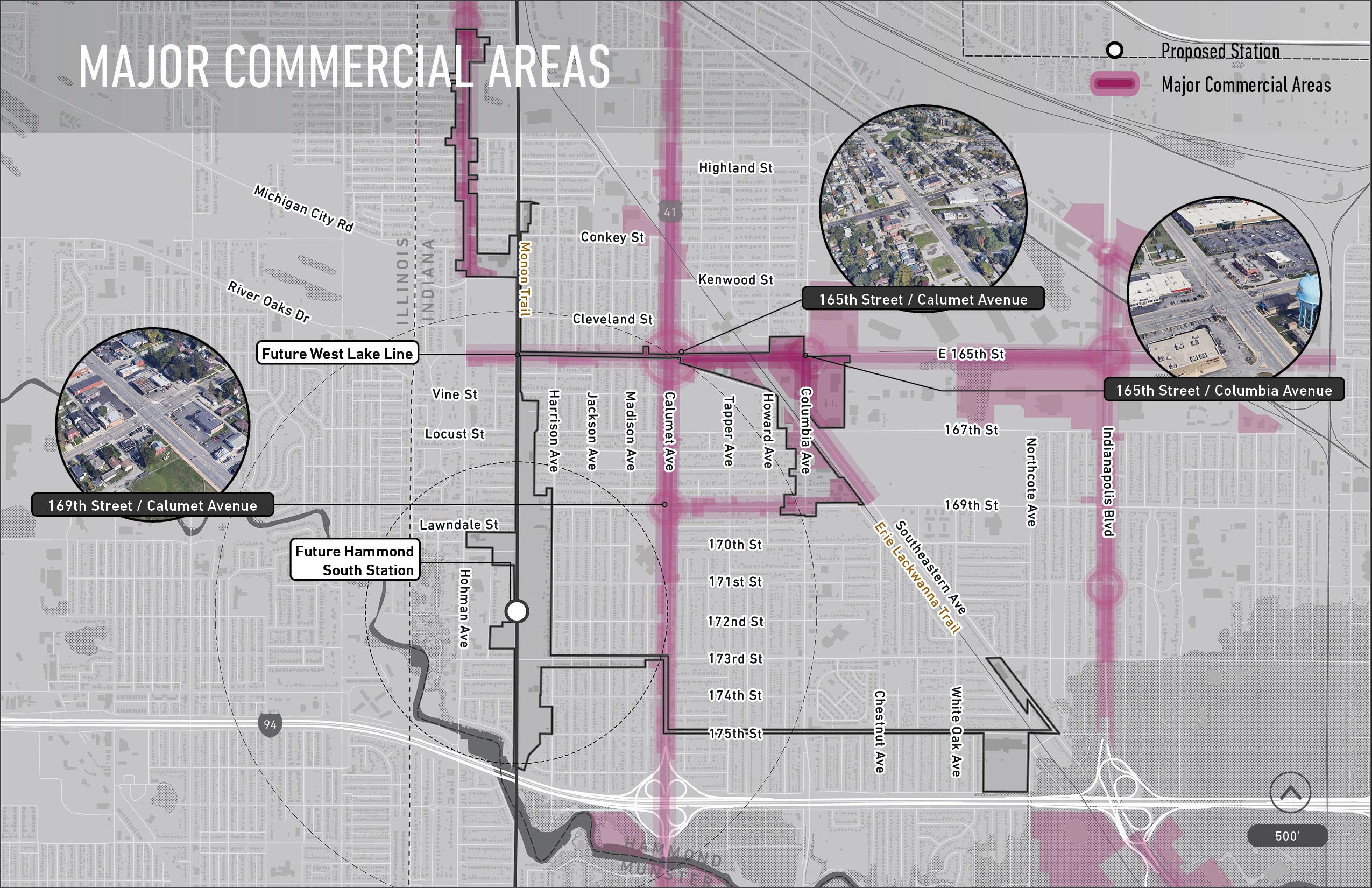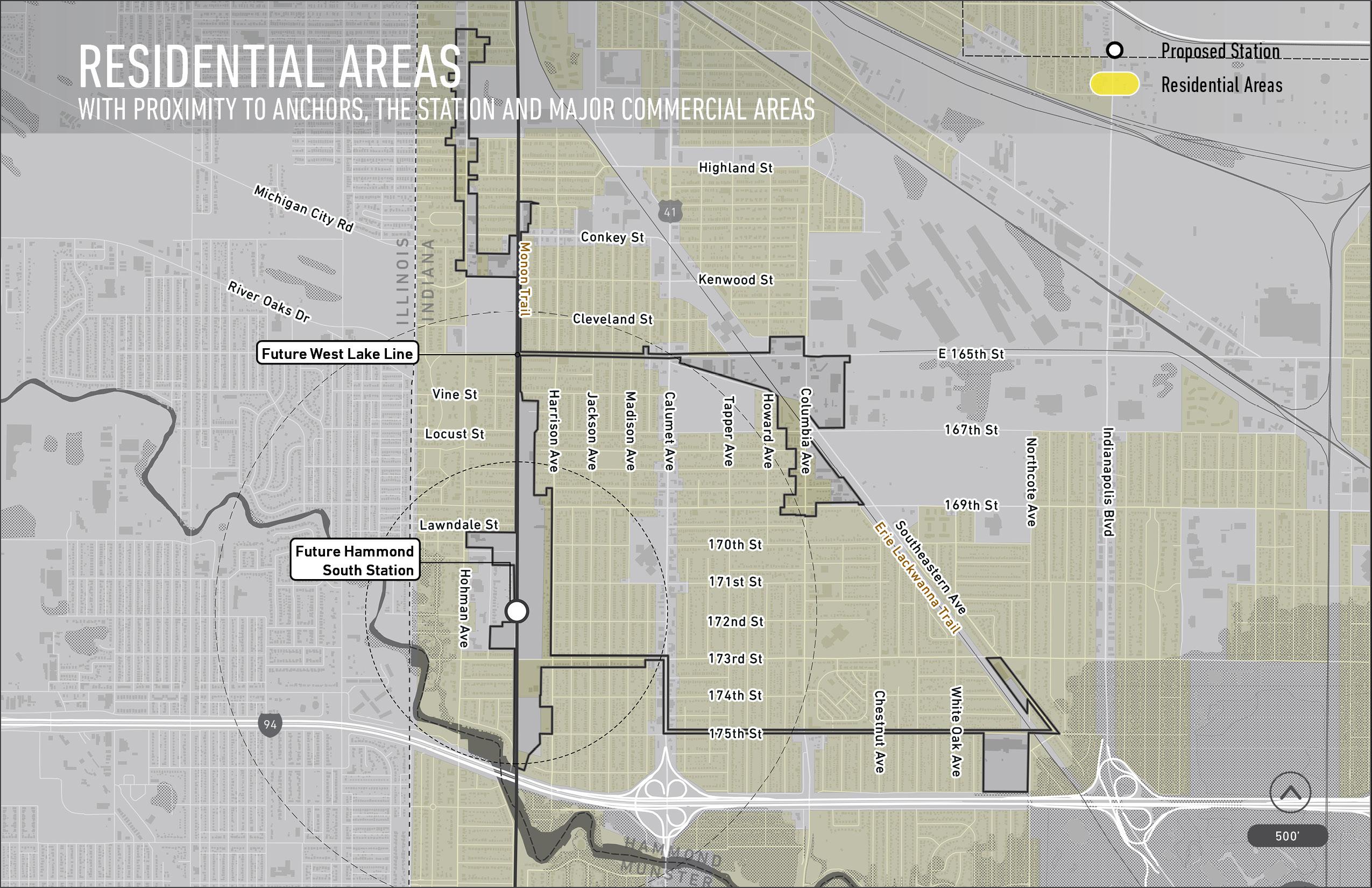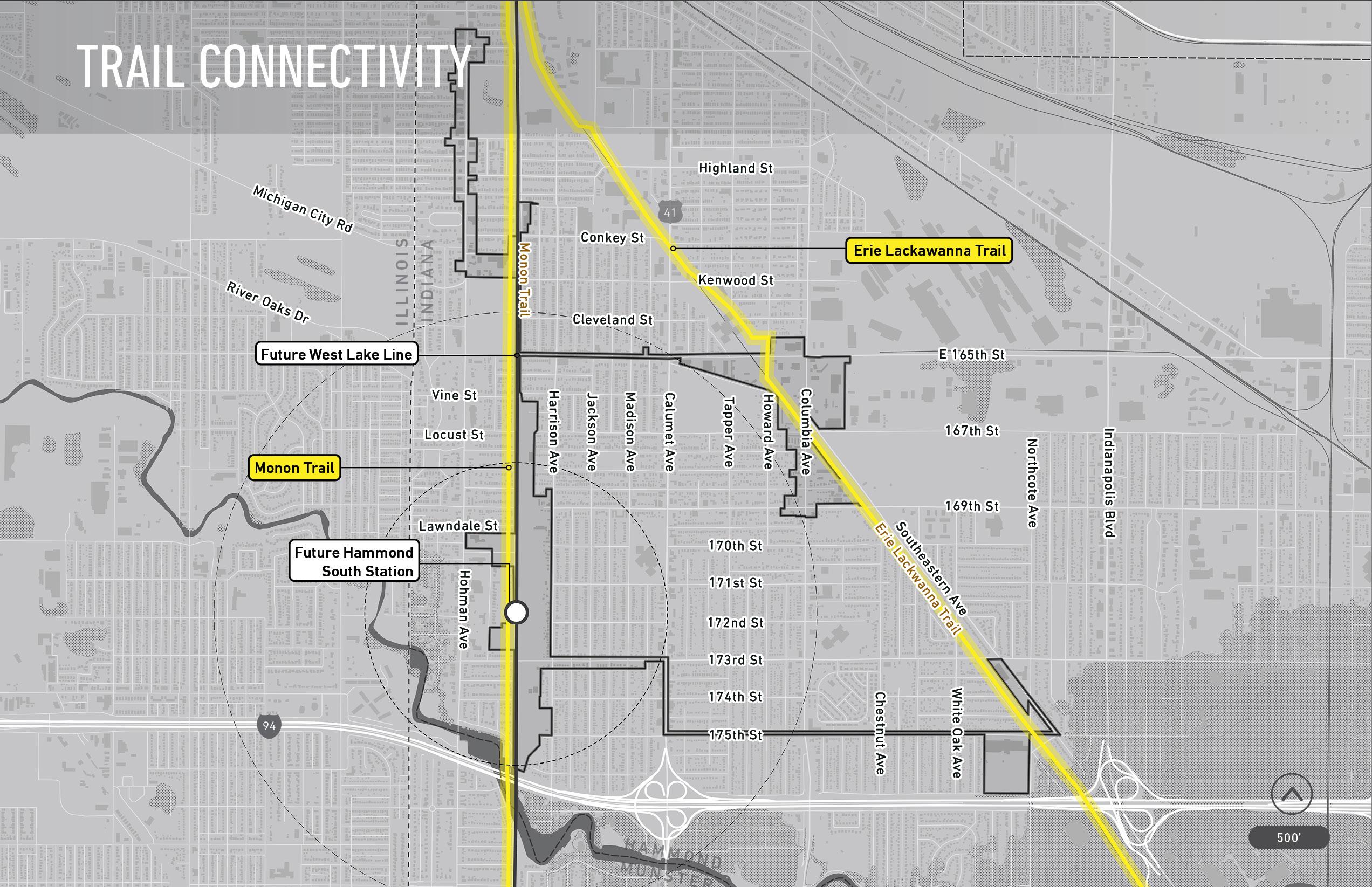 Trail-oriented development takes advantage of and leverages infrastructure that supports active ways of getting around in urban areas. In addition to transitoriented development opportunities, the South Hammond Station area has opportunities for trail-oriented development with the presence of two regional trails: the Monon Trail and the Erie-Lackawanna Trail.