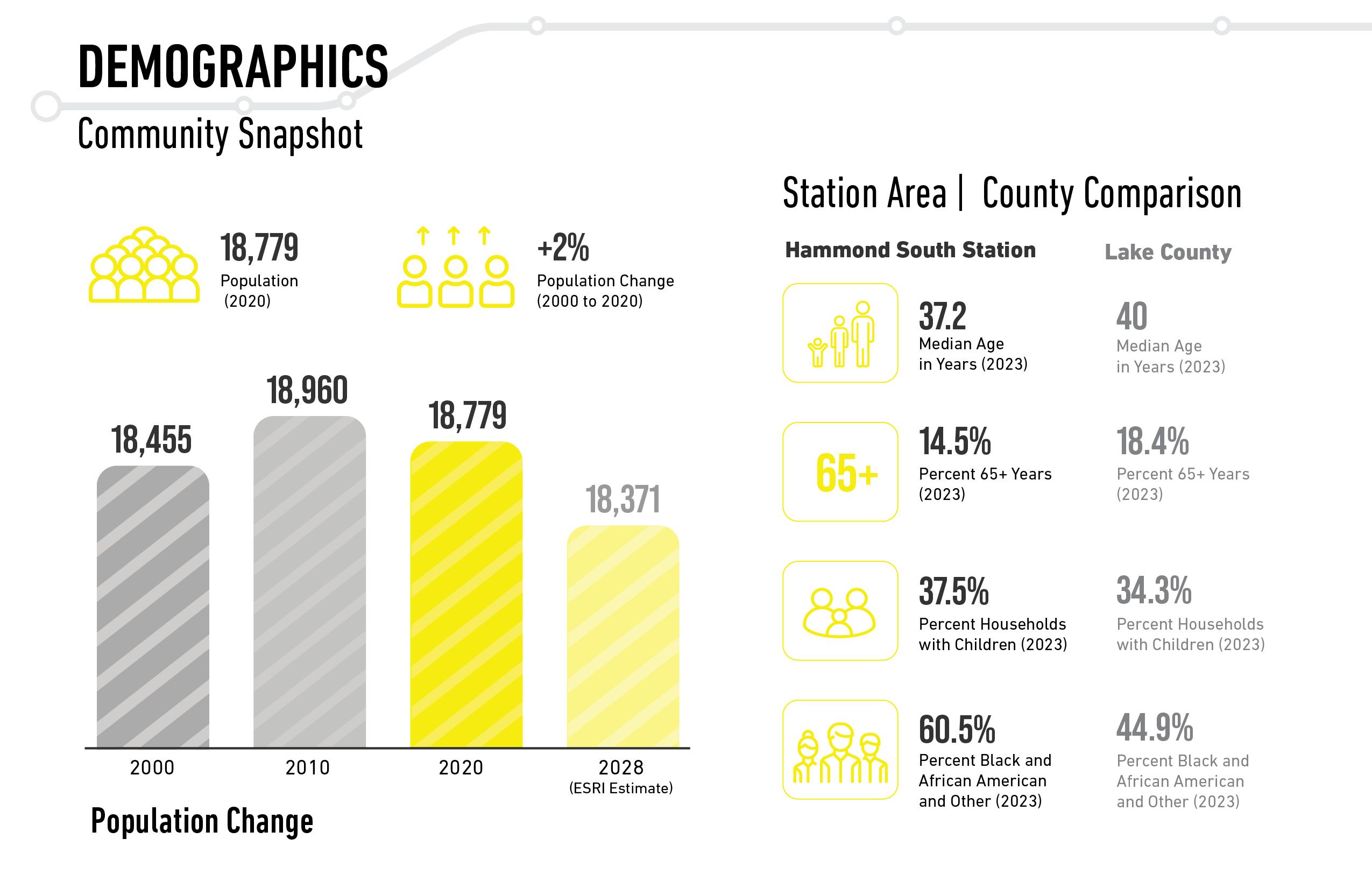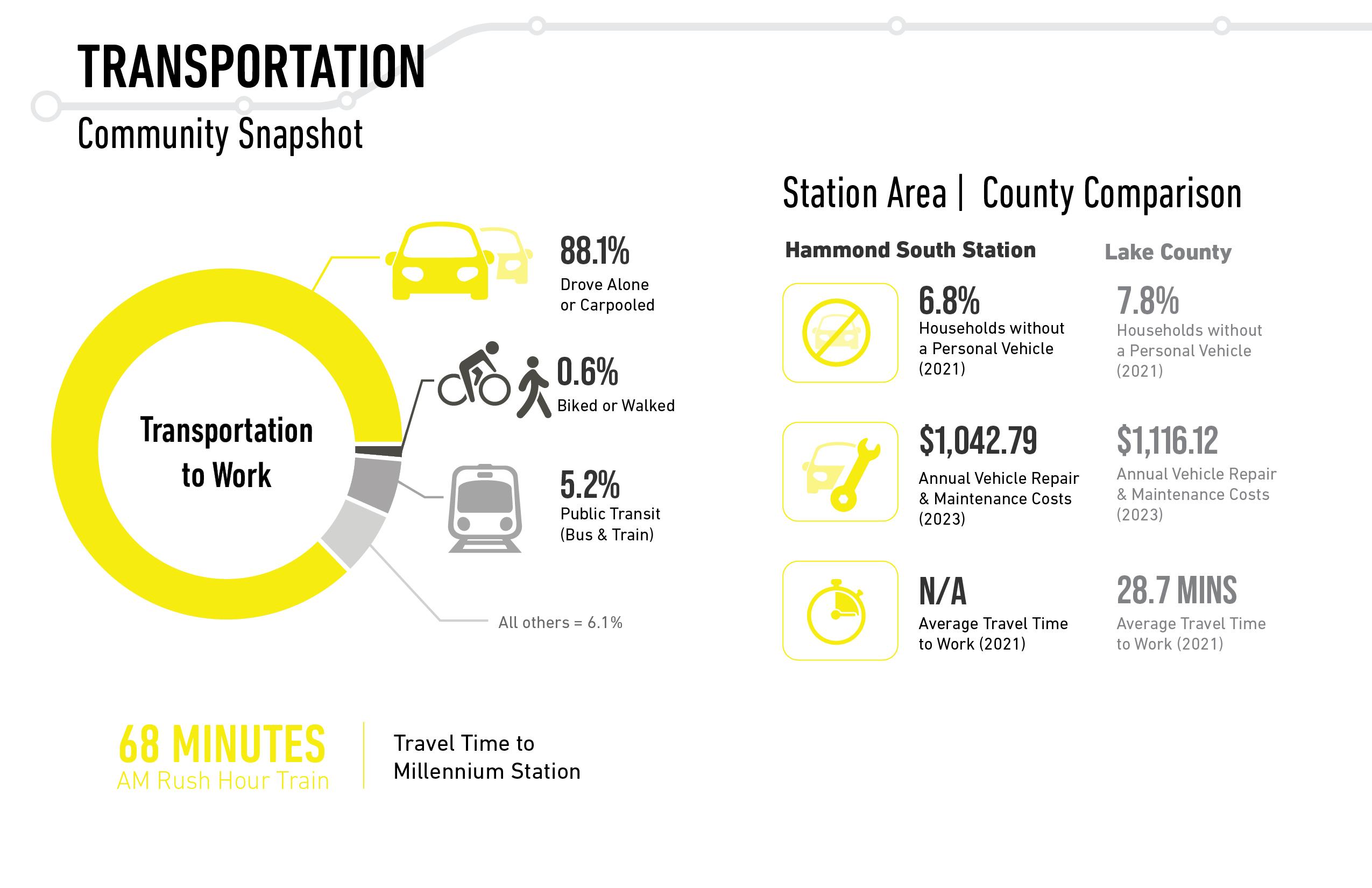 The community snapshot of demographic information included population change, age, and race traits. The community snapshot for transportation information included ways of traveling to work, vehicle ownership, and time spent traveling to work. The community snapshot of housing information included household characteristics, residential unit types and housing market traits. These walksheds illustrate the areas within five-, ten-, and fifteen-minute walking time from the station area. This map shows the Monon Trail & Erie Lackawanna Trail, two multi-use paths connecting Hammond to the region. The community snapshot of employment information included top employment sectors, education, and household income.