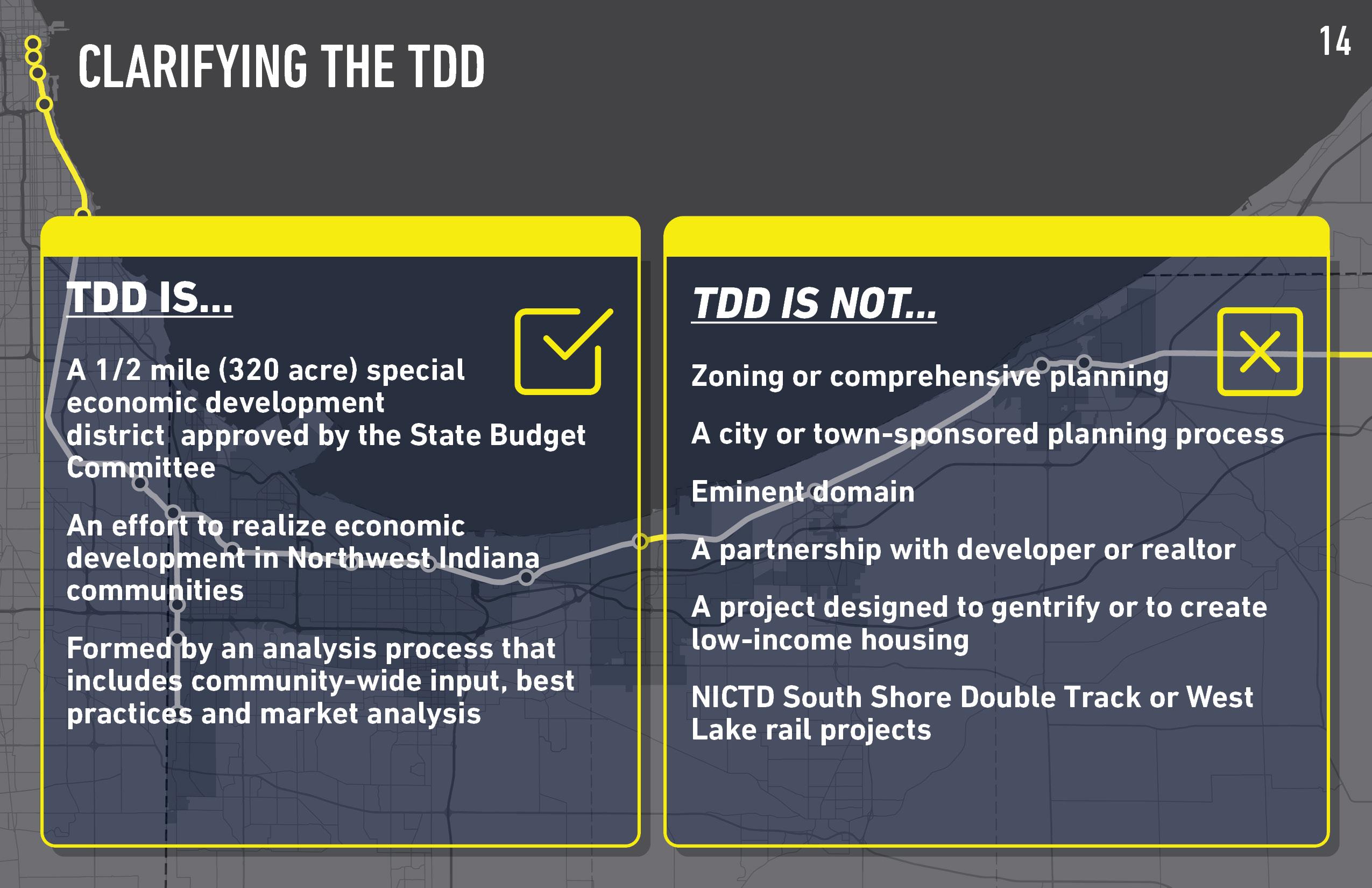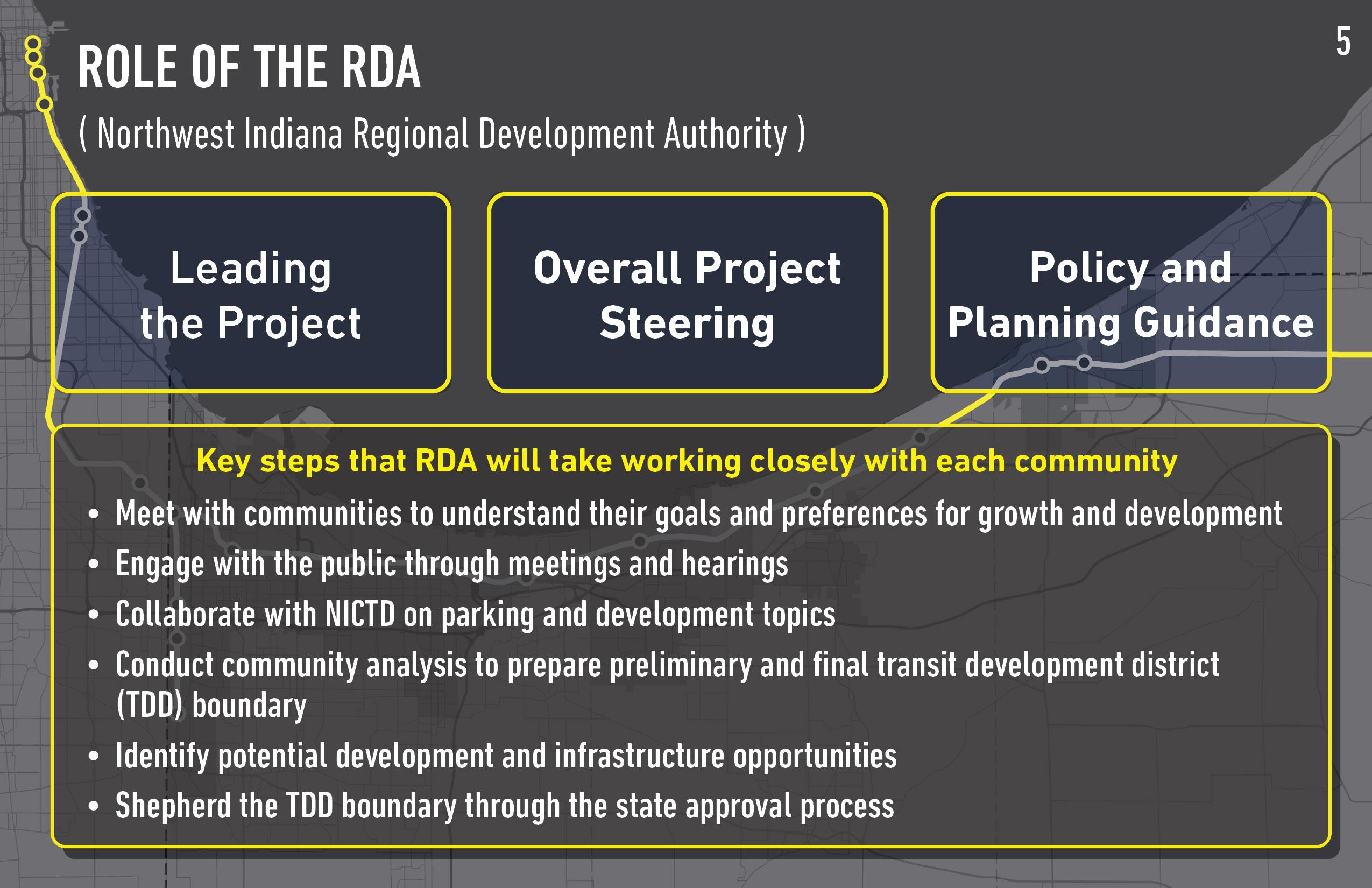 you will find the latest information about our project, our progress, and how to share your comments and ideas. PROJECT IMPACT: A GAME-CHANGER FOR NORTHWEST INDIANA COMMUNITIES A multi-disciplinary team is led by the Regional Development Authority (RDA) to work alongside Northwest Indiana Communities. The South Shore Double Track Project and West Lake Corridor Project include 25 Miles of rail extension or new second track. The Regional Development Authority (RDA) is leading this effort, offering policy and planning guidance to Northwest Indiana communities. WE ARE HERE! The project’s economic impact to Northwest Indiana will be a catalyst for growth and economic development. Our Project Gallery includes the following materials: 1 Project Orientation 2 What is a TDD and How Does it Work? 3 TDD Boundary Process & Criteria 4 Community Understanding 5 How We Developed the Boundary 6 South Hammond Station DRAFT Boundary 7 What Can Community Growth Look Like? LET’S GET STARTED! PLEASE REVIEW OUR MATERIALS IN THE ORDER SHOWN HERE HAVE QUESTIONS? CONTACT DAVID WELLMAN, COMMUNICATIONS MANAGER/RDA E: DWELLMAN@RDA.IN.GOV P: (219) 644-3506
