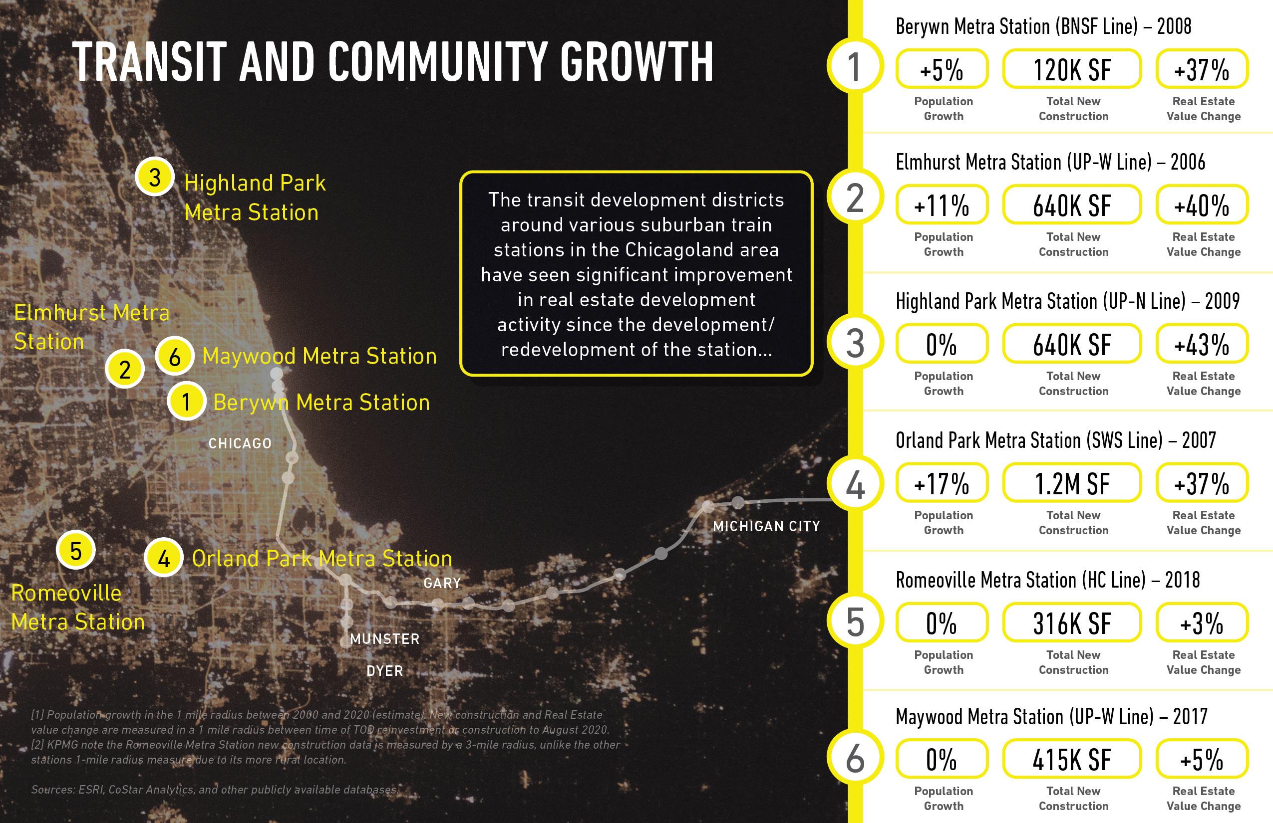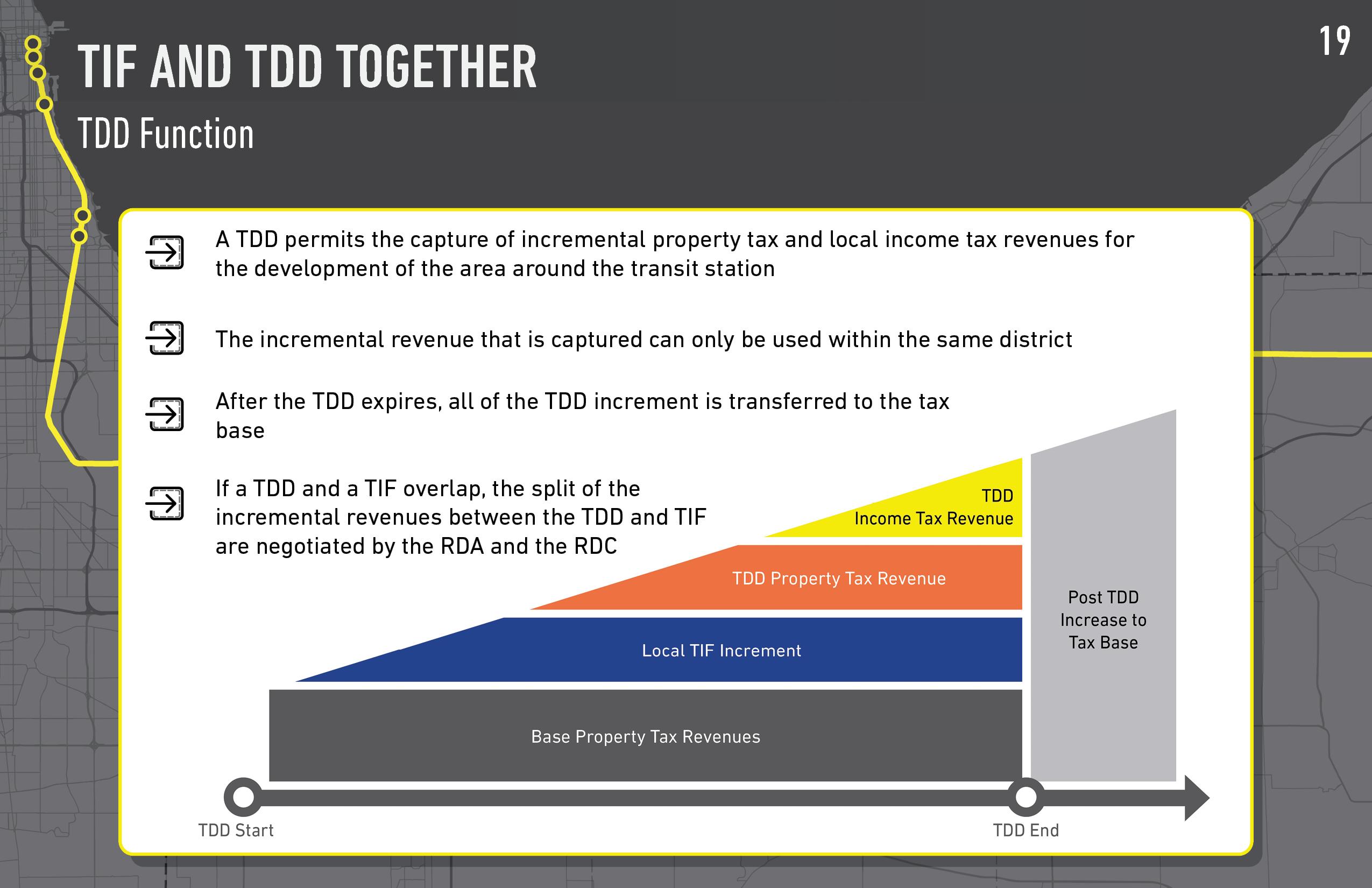 A TDD is a special economic development district not a rezoning or eminent domain tool. TDD’s are continguous boundaries drawn around station areas, and must be no more than 0.5 square miles (320 Acres) in area. Across the Chicagoland region, TDDs have led to significant population growth, construction, and increases in property market value. What is a TIF? Tax increment financing districts divert property tax revenue increases in a defined area to fund economic development projects or public improvement projects in the community. What is a TDD? Transit development districts capture the incremental growth in local property and income tax revenue, for use in public investment related to the station area.