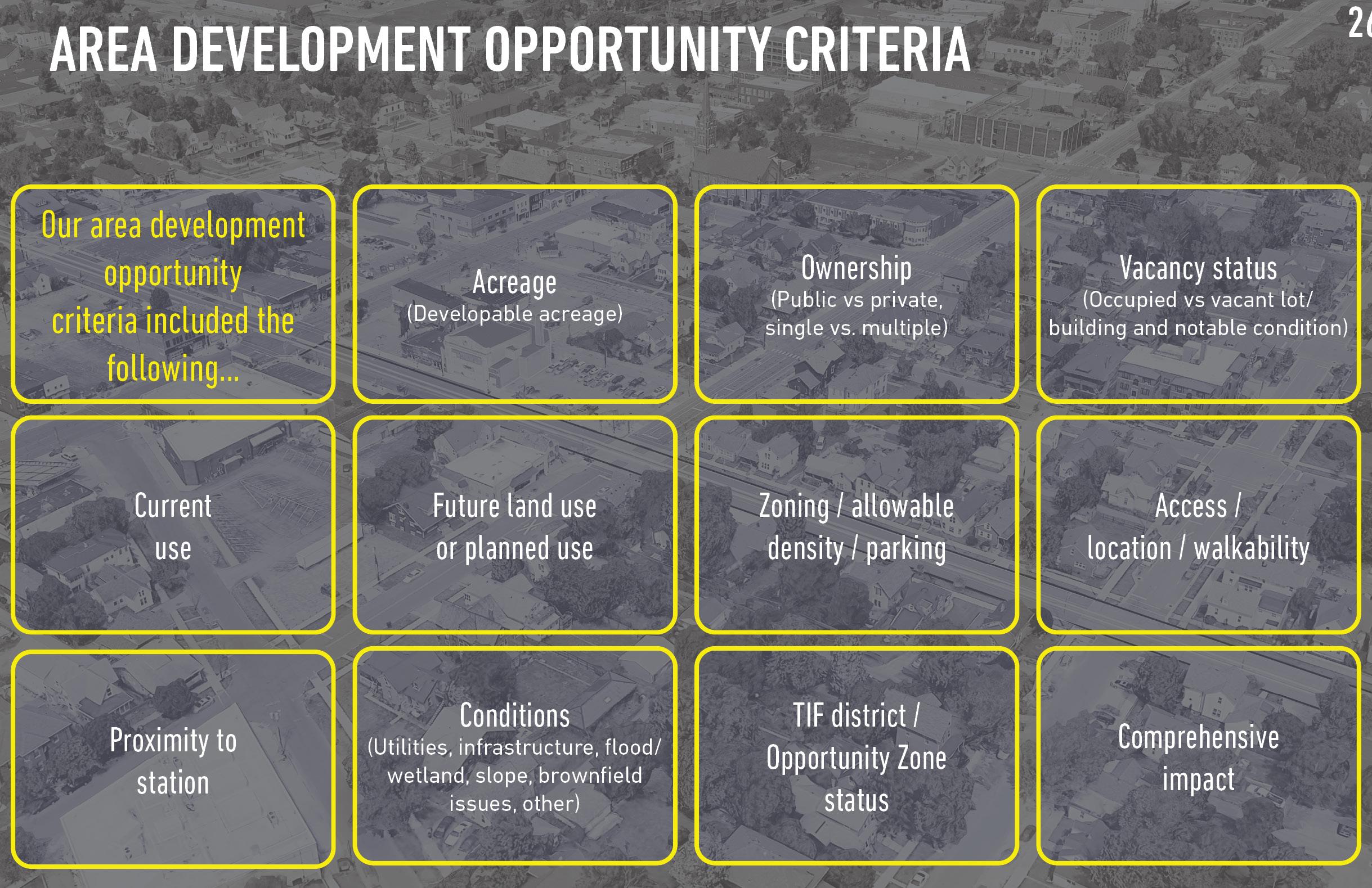 BOUNDARY PROCESS: A STEP-BY-STEP GLANCE AT HOW WE RAN OUR ANALYSIS STEP 1 Look at the existing nodes of activitythe anchors in the area that have an outsized effect on their surroundings. STEP 4 Look at the existing vacant, underutilized, or publicly-owned land these sites present prime opportunity for redevelopment STEP 3 Look at the highlighted residential areas - these areas are near anchors, the station, and major commercial areas STEP 2 Look at the existing major commercial areas - these corridors and areas are destinations that generate economic activity STEP 5 Existing TIF District and Opportunity Zone boundaries overlap with the draft boundary STEP 6 Look at the Station Area Boundary highlighted in yellow - this highlights the 205.92 acre draft boundary.