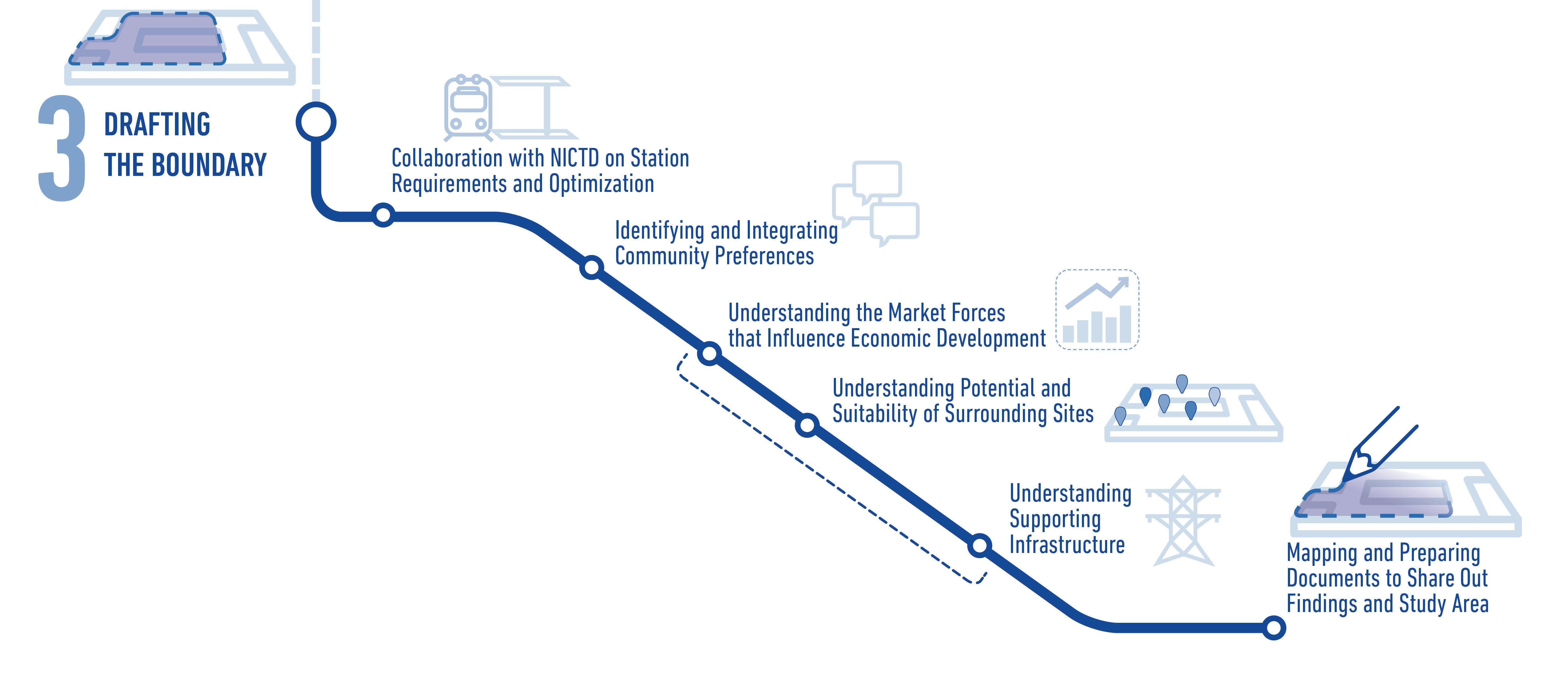 3 Drafting the Boundary - collaboration with NICTD on station requirements and optimization, integrating community preferences, understanding market forces for economic development, understanding suitability of surrounding sites, understanding supporting infrastructure, and preparing information to report out findings.