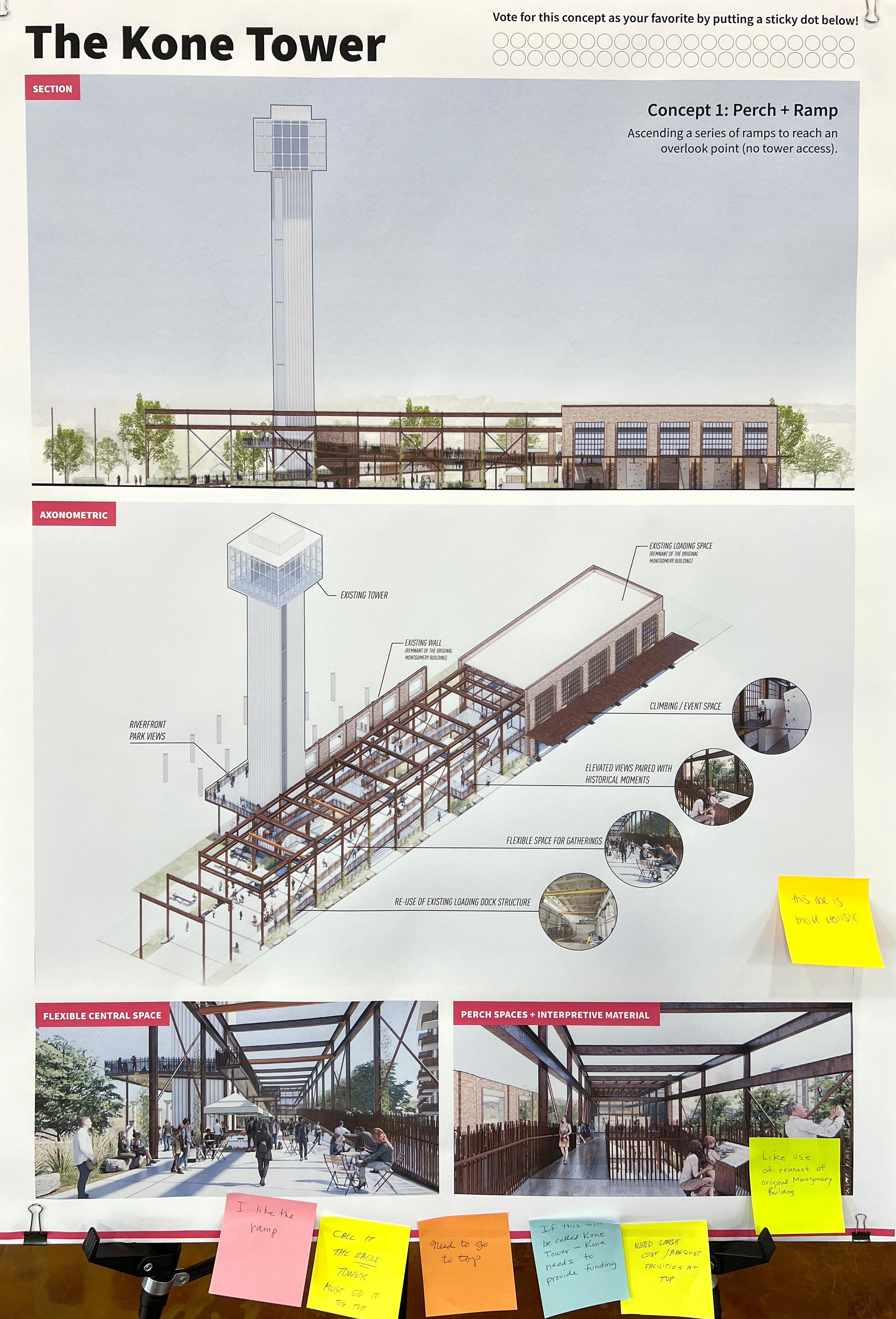 Equitable access to the Mississippi River, and Naturalized landscapes and demonstration gardens. Kone Tower is visible for miles and stands in a prominent spot. Every one knows Kone Tower and associates it with MOLINE.