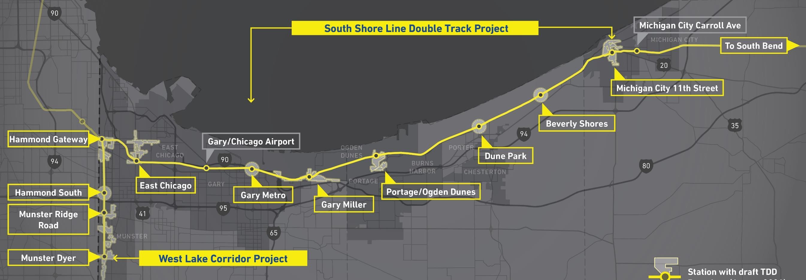 10 TDDs have been approved: Munster/Dyer Main Street, Munster Ridge Road, Hammond South, Hammond Gateway/Downtown, East Chicago, Gary Metro, Gary Miller, Portage/Ogden Dunes, Porter (Dune Park) and Michigan City.