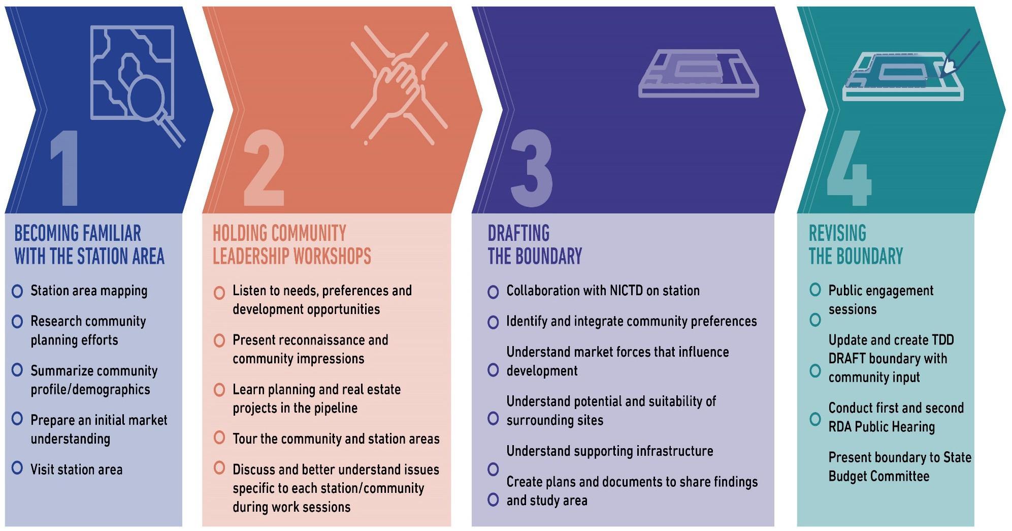 • Conduct community analysis to prepare preliminary and final transit development district (TDD) boundary