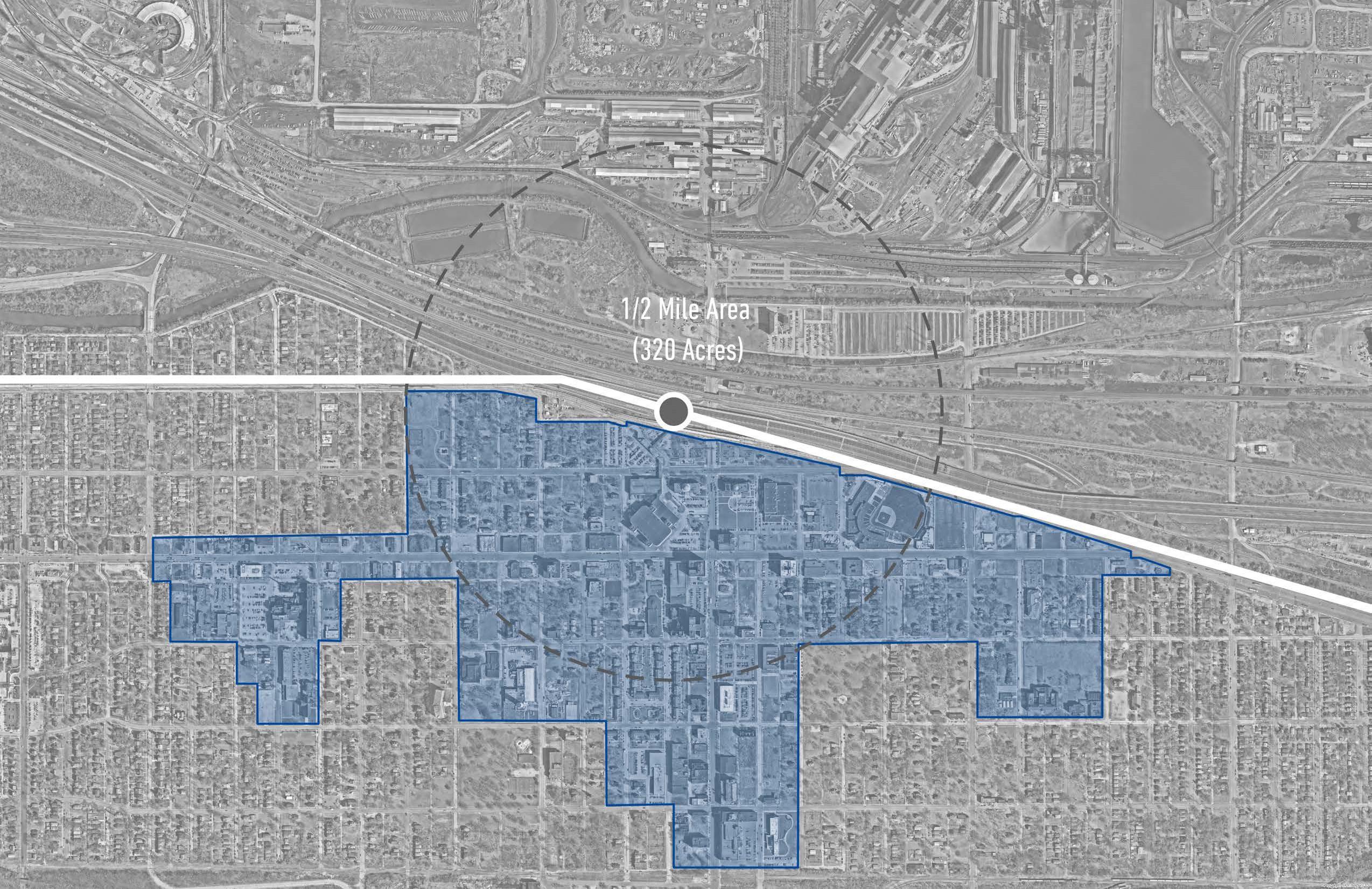 Transit development districts are contiguous boundaries drawn around station areas, and must be no more than 0.5 square miles (320 Acres) in area.