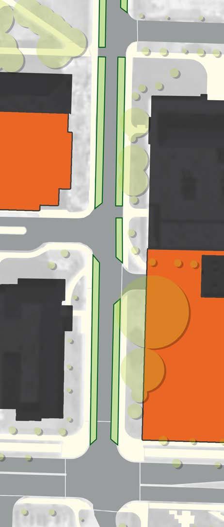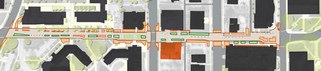 • Implement bioretention along the outside edge of mall walks, replacing street parking at mall, and in specified plantings.