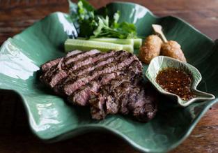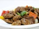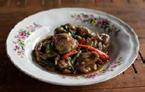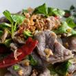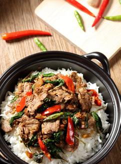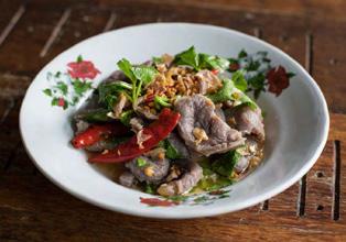 Marbled beef slices, stir-fried with Thai basil and chili.