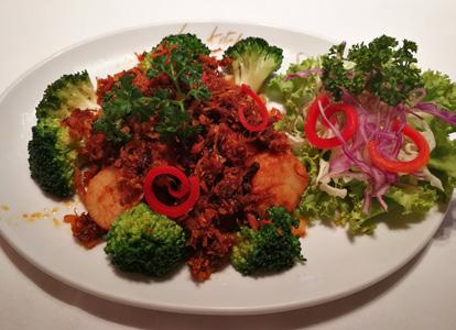 Chunky Nue Aon fish meat, deep-fried and drysauteed with Thai sweet and spicy curry.