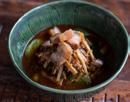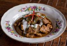 Marbled beef shank red curry topped with fresh coconut milk and chopped kaffir lime leaves.