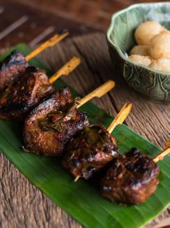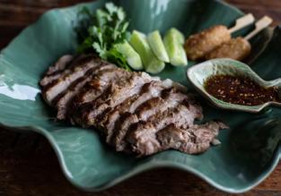 Chunks of tender pork meat stewed with Thai herbs and cha muang leaves.