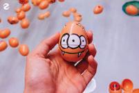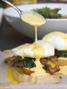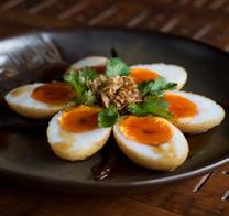 Fried medium-boiled eggs served with three-flavor sauce and fried shallots.