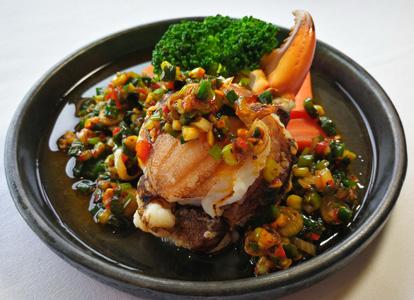 Stir-fried Surat Thani’s colossal crab meat lumps with yellow bell peppers and yellow chili paste.