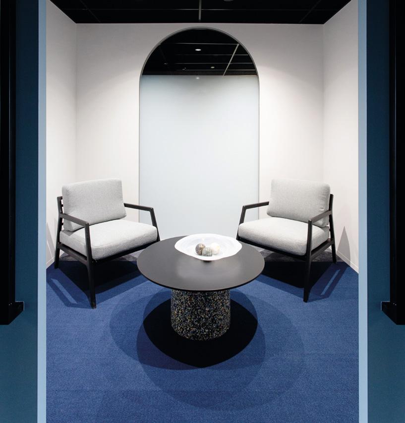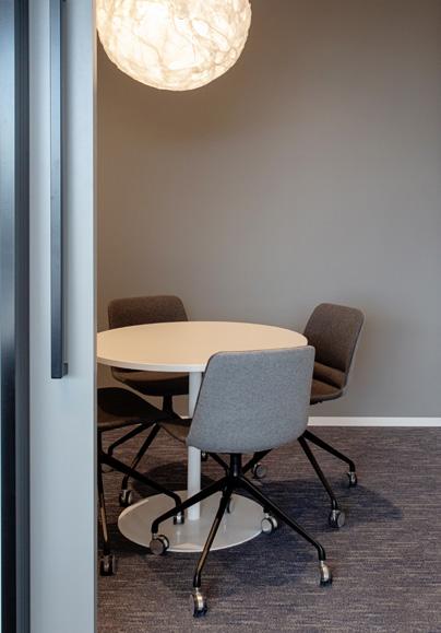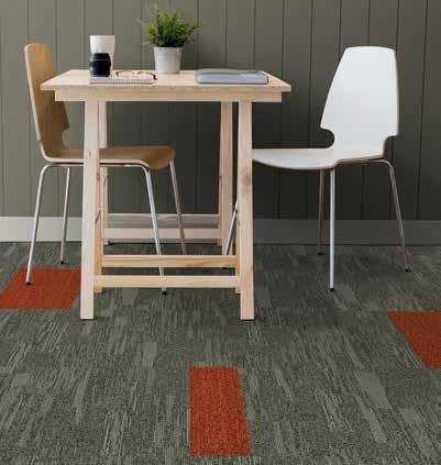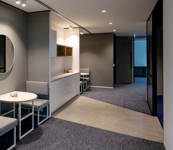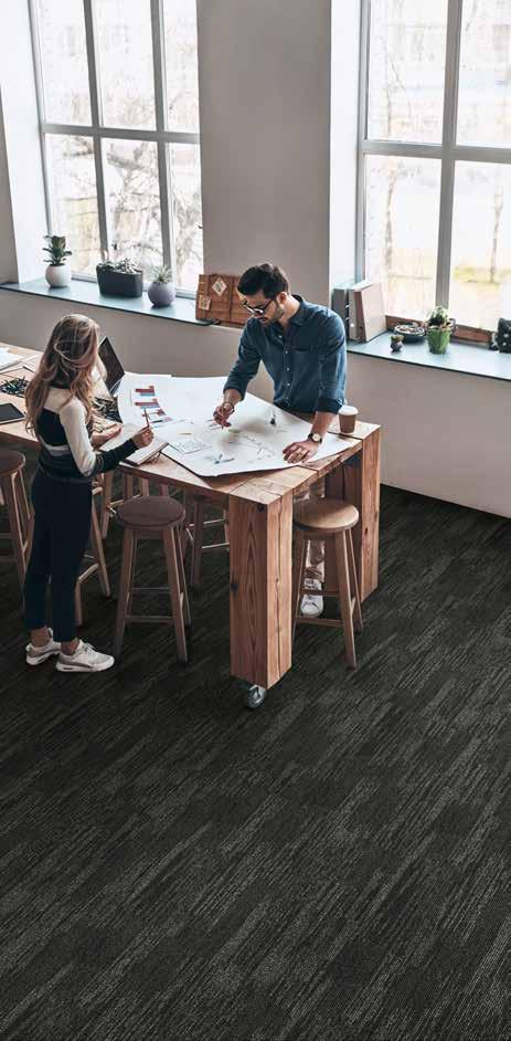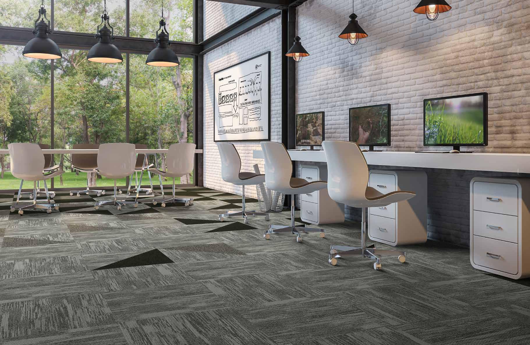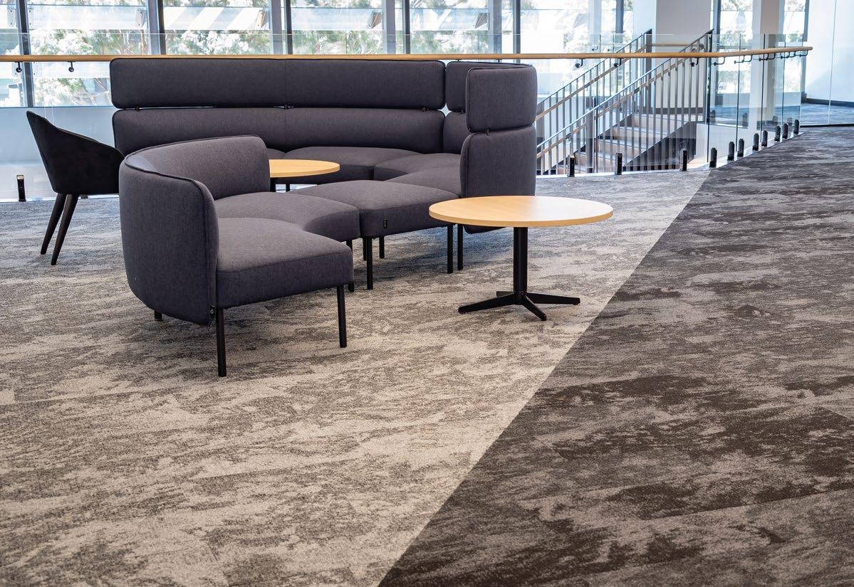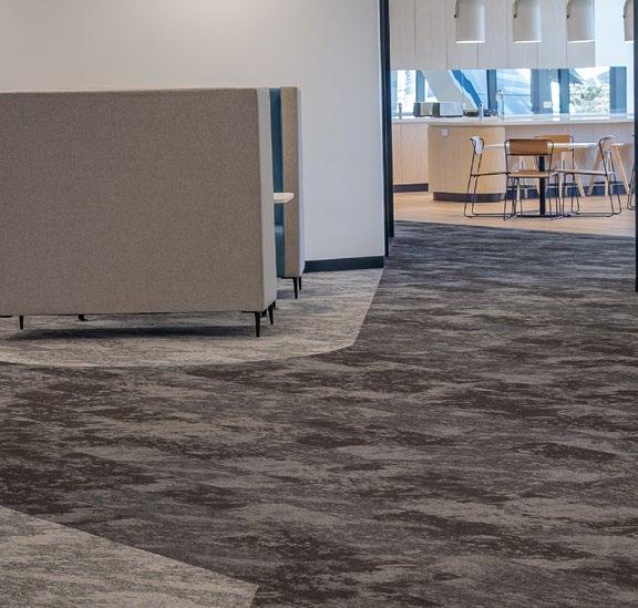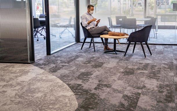 ELEGANT AND ECO-FRIENDLY, THE BETON STRATA AND BETON SCREED CARPET TILES FROM CARPETS INTER’S INNOVATIVE ECOSOFT® SERIES GIVE THIS CONTEMPORARY OFFICE A UNIQUE AESTHETIC.