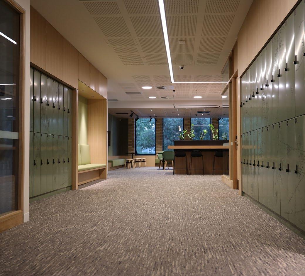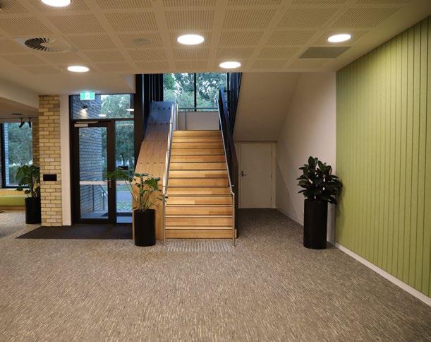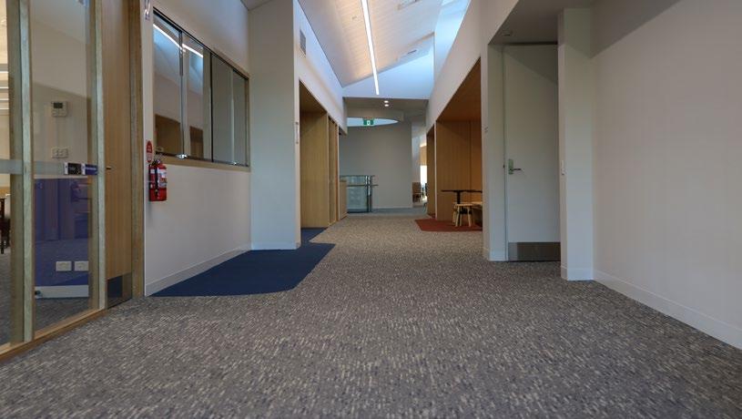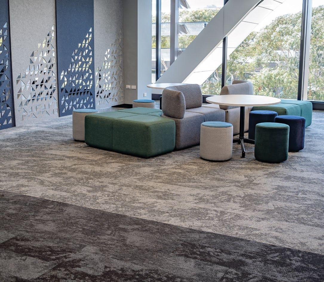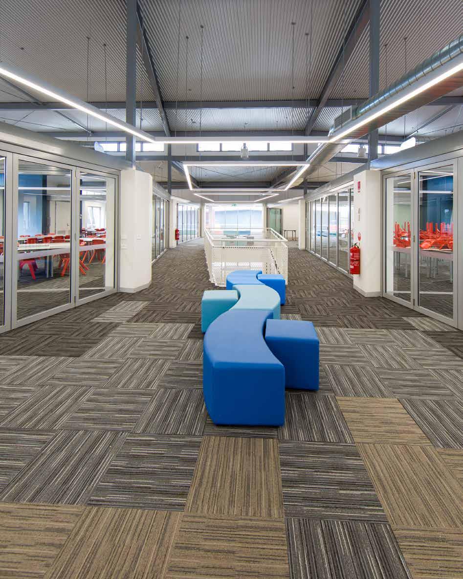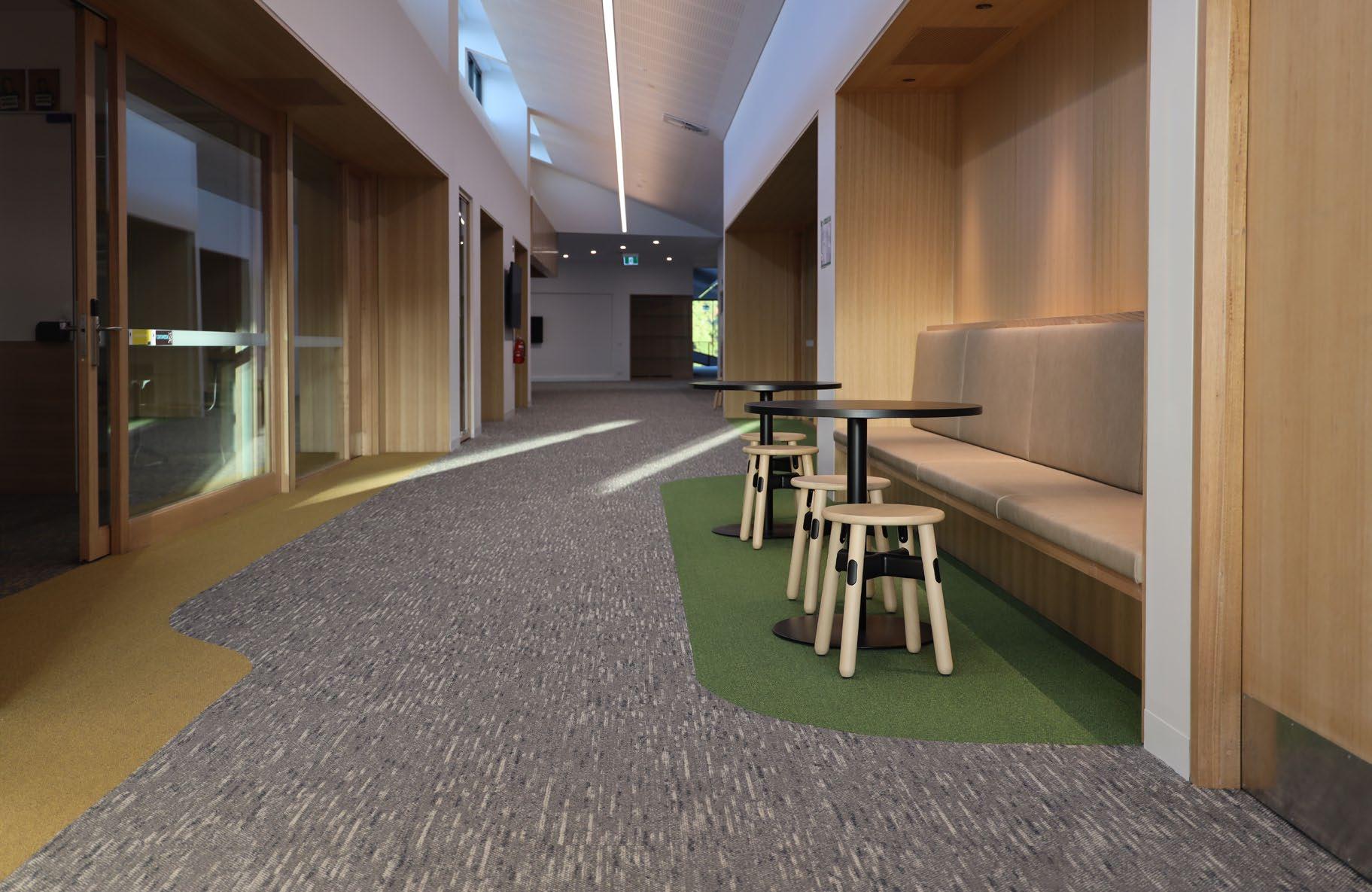 CARPETS INTER’S ECO-FRIENDLY CARPET TILES BEAUTIFULLY BLEND WITH THE EXCEPTIONAL DESIGN LANGUAGE OF THE FERNTREE GULLY CAMPUS PROJECT TO CREATE A SERENE AND COSY ENVIRONMENT FOR LEARNING.
