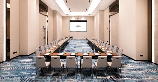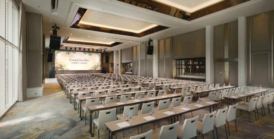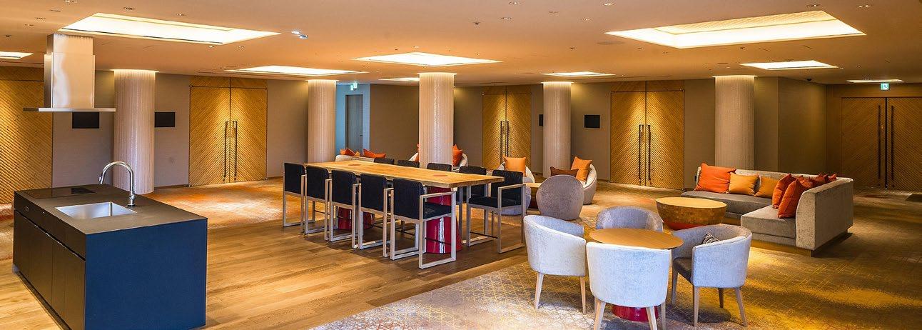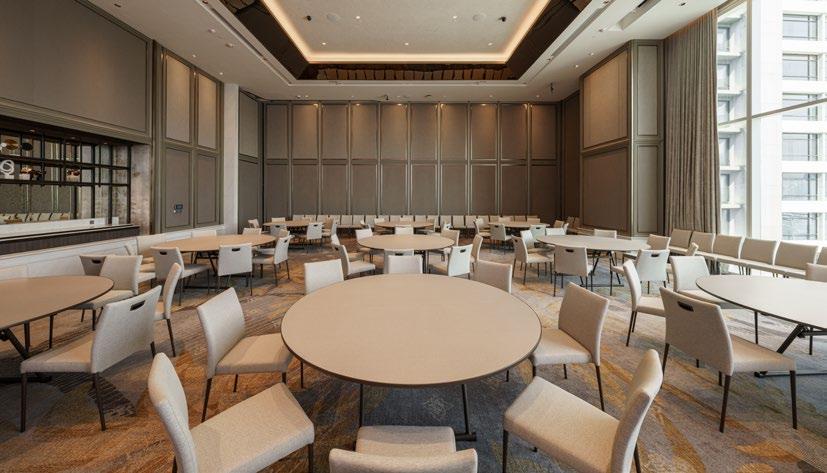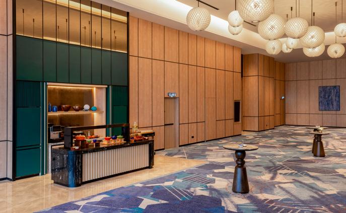 and tonal depth enhance the scale of the space while supporting acoustic performance and flexible event configurations. The adjacent prefunction areas continue this language, with calibrated pattern scale defining circulation and gathering zones while maintaining visual calm and spatial clarity for large-scale events.