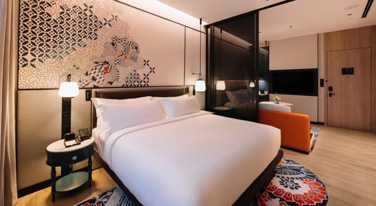 At the lobby and public areas, a forest-inspired theme greets visitors warmly, ushering them into different spaces in an imaginative way. Throughout the hotel, it is akin to walking through trees in a forest, where the scenery changes – thanks to decorative elements like bamboo art and Onta-yaki pottery, complemented by Royal Thai’s hand-tufted carpet with bright Silken fibre accent. At the lobby bar, Royal Thai’s carpet with an enchanting motif brings out the vibrant space showcasing a feature wall with exquisite art pieces made by local Japanese artisans.