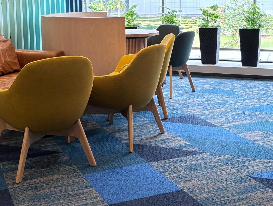 Built on Carpets Inter’s award-winning EcoSoft backing, the tiles offer exceptional acoustic performance and underfoot comfort—vital in dynamic, open-plan environments. Their texture and tactility deliver a sensory experience that aligns perfectly with the office’s biophilic design cues, echoing elements of moss, stone, and leaf. It’s a visual rhythm that enhances the surrounding material palette while encouraging movement and flow.