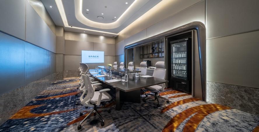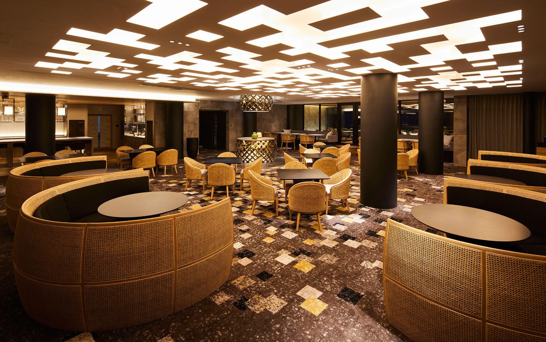 A soft atmosphere ensues in the meeting room and club lounge, where Royal Thai’s Axminster carpet with bright Silken fibre accent in elegant tones set the stage for a cosy social space to network and get together. Similarly, dazzling Axminster carpeting with geometric motifs enhances the seating landscape comprising woven furniture in the restaurant.