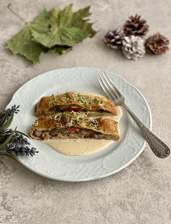 ‘Strudel’ de ternera con escalivada, champiñones y espinacas