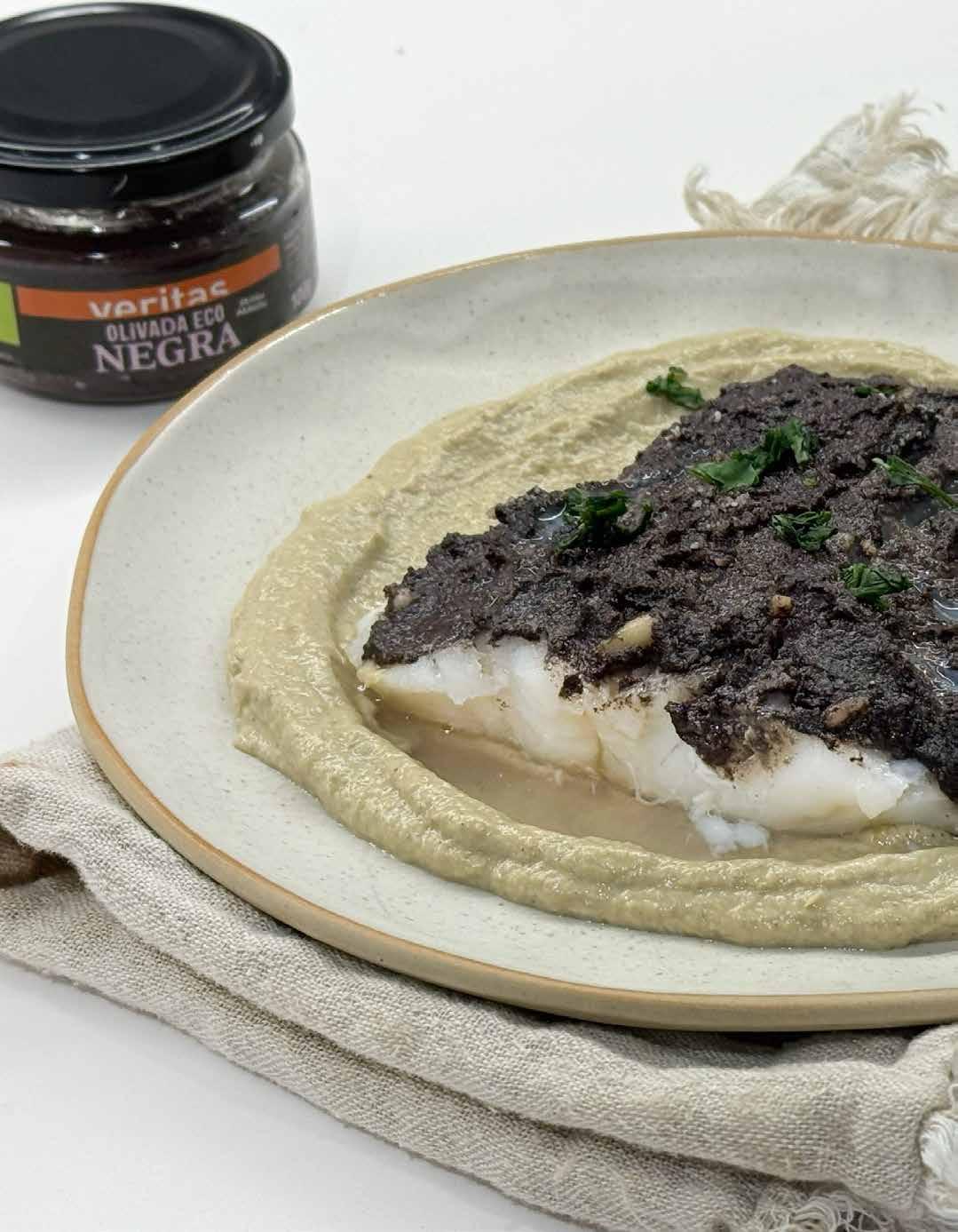 Bacallà amb crosta d'olivada negra i puré de carxofa
