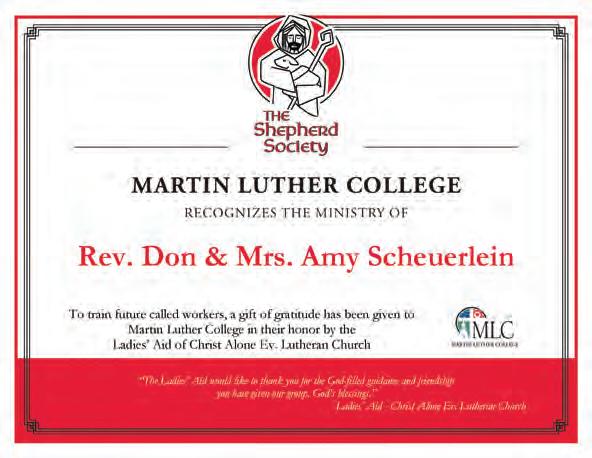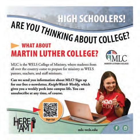MLC InFocus is published by Martin Luther College Mission Advancement Office and is distributed free of charge to students, faculty, staff, alumni, parents, and friends. Comments are welcomed and should be directed to gaugerlf@mlc-wels.edu or Laurie Gauger, MLC InFocus, 1995 Luther Court, New Ulm MN 56073. The mission of MLC is to train men and women to meet the public ministry needs of the Wisconsin Evangelical Lutheran Synod.