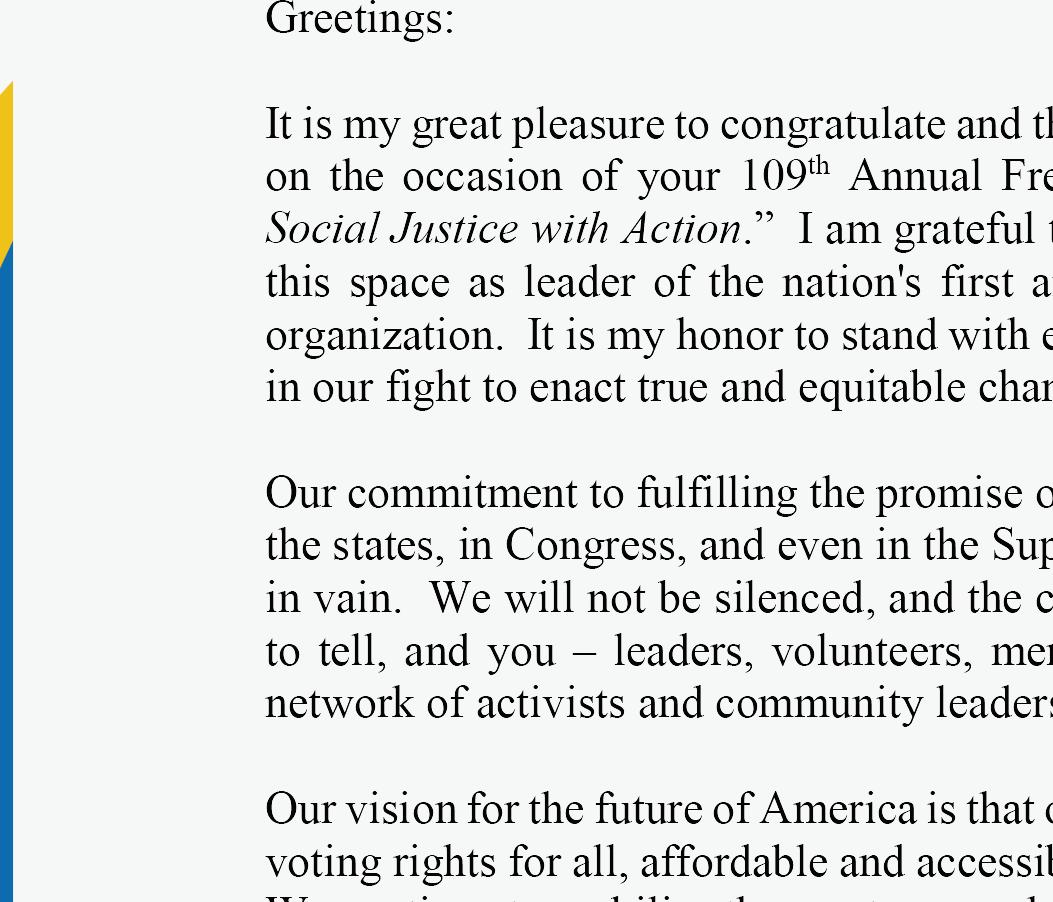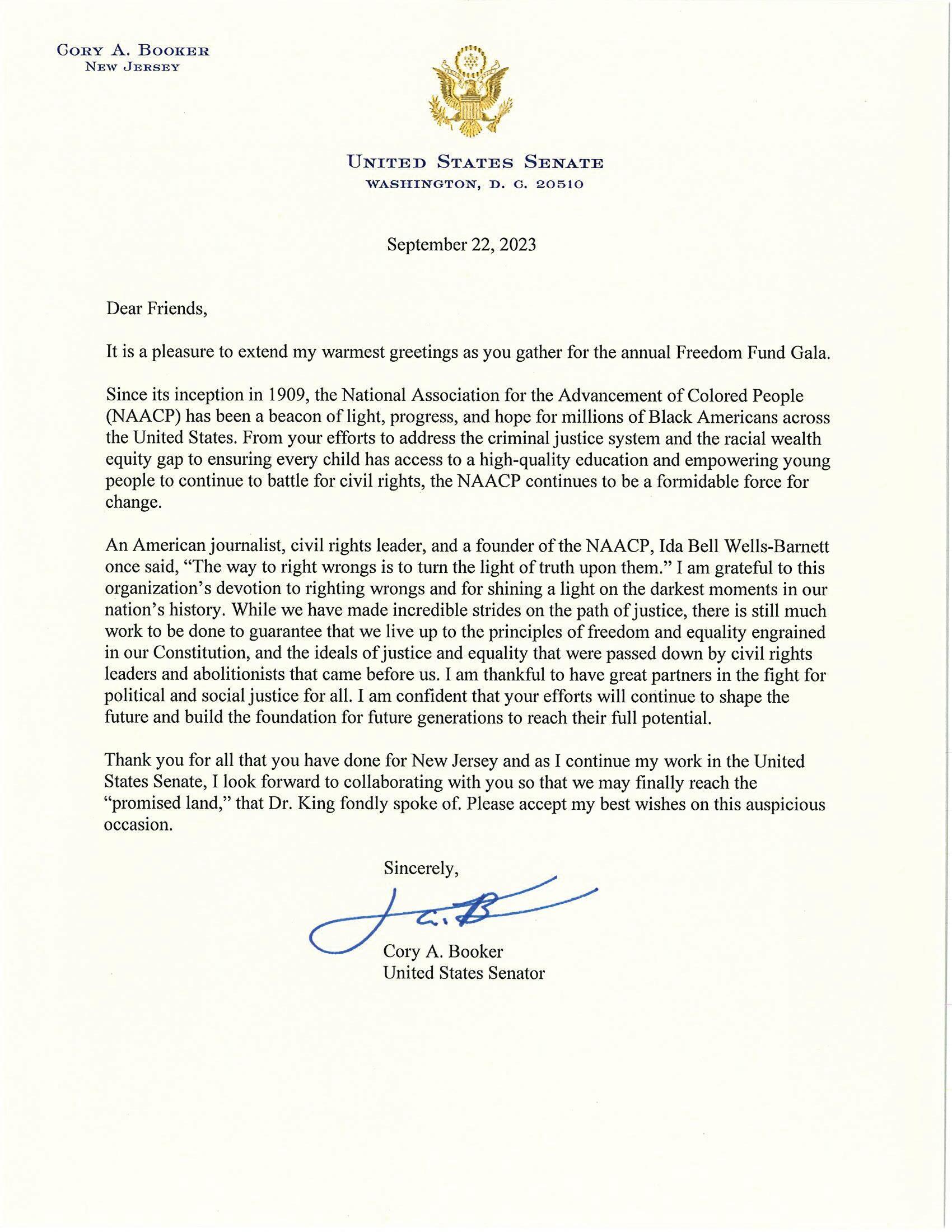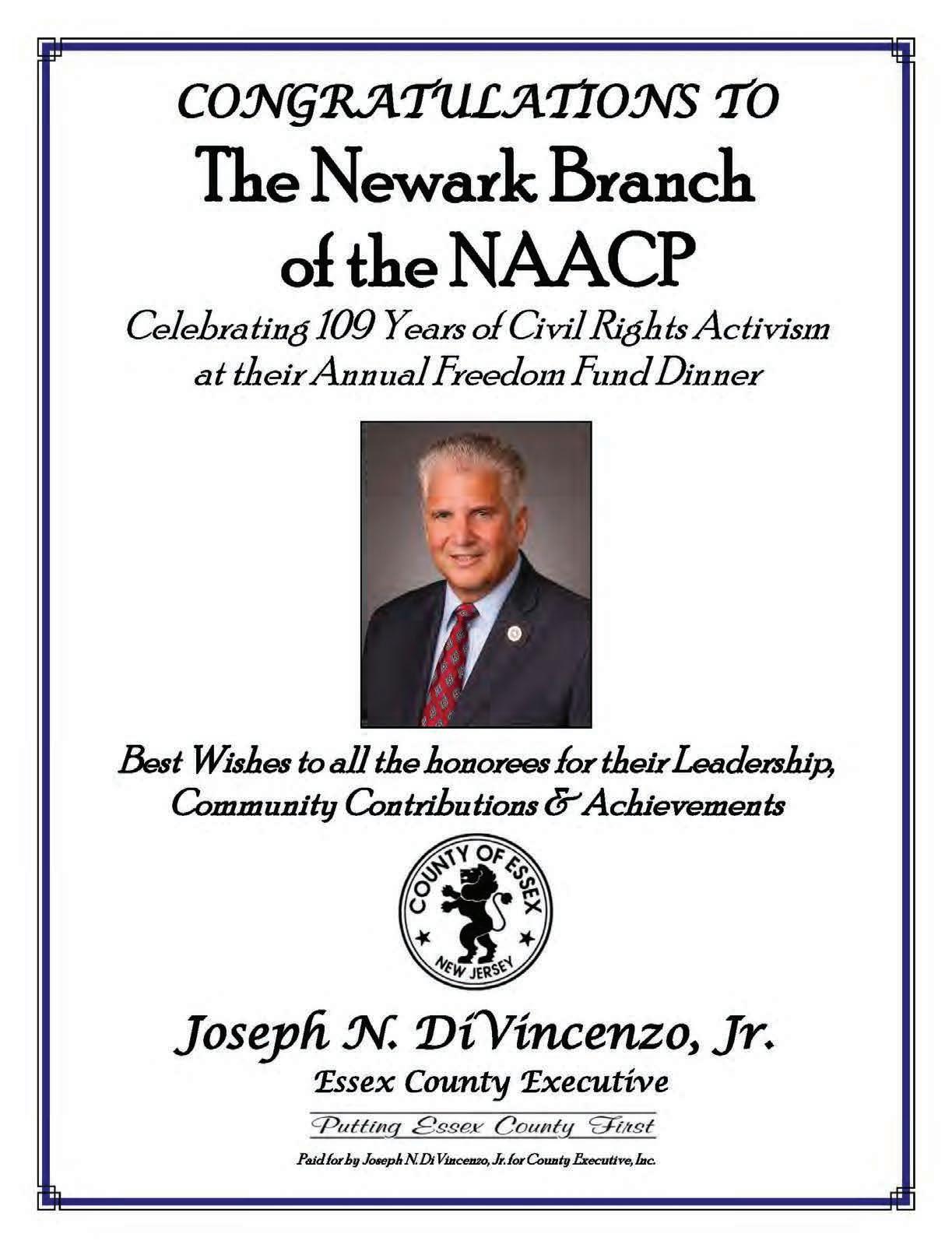 On behalf of the entire City of Newark, it is my pleasure to congratulate the Newark Branch of the NAACP at its annual Freedom Fund Awards Luncheon and to the organization as a whole on its 109th anniversary.