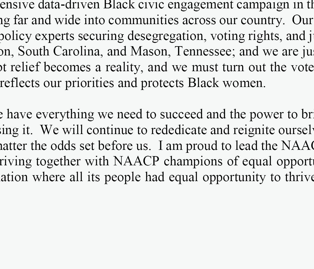 This morning's luncheon is themed "Affirming Social Justice with Action!" This concept is truer than ever at a time when legislators and courts are seeking to deny people of color their right to vote and gerrymandering legislative districts against them. It is not enough that African-Americans vote ...they must be able to vote, and their votes must be counted.